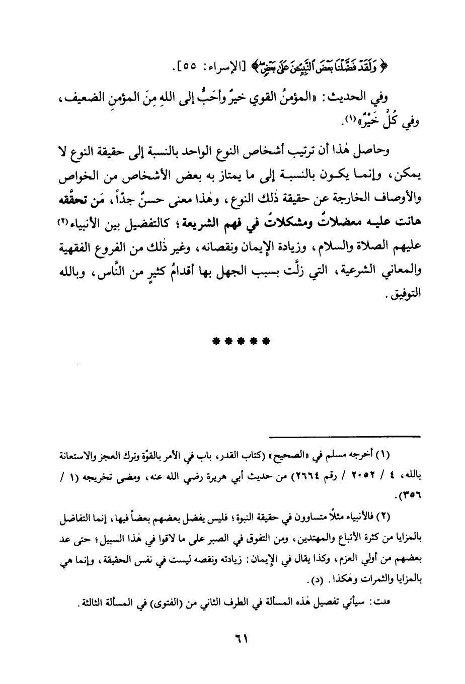 2 فالأنبياء مثلا متساوون في حقيقة النبوة، فليس يفضل بعضهم بعضا فيها، إنما التفاضل بالمزايا من كثرة الأتباع والمهتدين، ومن التفوق في الصبر على ما لاقوا في هذا السبيل، حتى عد بعضهم من أولى العزم، وكذا يقال في الإيمان: زيادته ونقصه ليست في نفس الحقيقة، وإنما هي بالمزايا والثمرات وهكذا. "د".