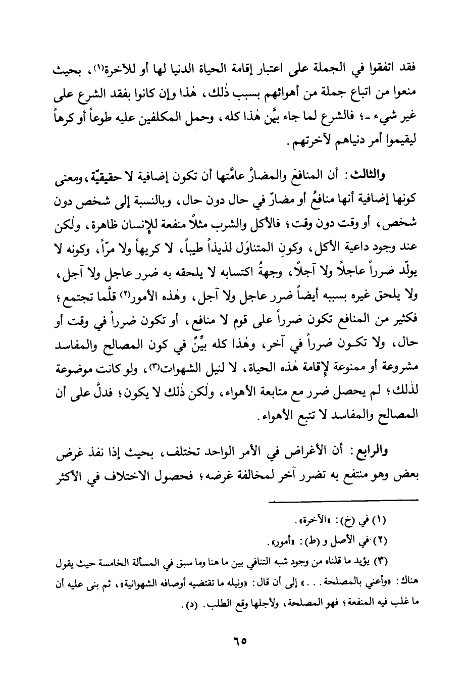 أَنَّ الْمَنَافِعَ وَالْمَضَارَّ عَامَّتَهَا أَنْ تَكُونَ إِضَافِيَّةً لَا حَقِيقِيَّةً، وَمَعْنَى كَوْنِهَا إِضَافِيَّةً أَنَّهَا مَنَافِعُ أَوْ مَضَارُّ فِي حَالٍ دُونَ حَالٍ، وَبِالنِّسْبَةِ إِلَى شَخْصٍ دُونَ شَخْصٍ، أَوْ وَقْتٍ دُونَ وَقْتٍ، فَالْأَكْلُ وَالشُّرْبُ مَثَلًا مَنْفَعَةٌ لِلْإِنْسَانِ ظَاهِرَةٌ، وَلَكِنْ عِنْدَ وُجُودِ دَاعِيَةِ الْأَكْلِ، وَكَوْنِ الْمُتَنَاوَلِ لَذِيذًا طَيِّبًا، لَا كَرِيهًا وَلَا مُرًّا، وَكَوْنِهِ لَا يُوَلِّدُ ضَرَرًا عَاجِلًا وَلَا آجِلًا، وَجِهَةُ اكْتِسَابِهِ لَا يَلْحَقُهُ بِهِ ضَرَرٌ عَاجِلٌ وَلَا آجِلٌ، وَلَا يَلْحَقُ غَيْرَهُ بِسَبَبِهِ أَيْضًا ضَرَرٌ عَاجِلٌ وَلَا آجِلٌ، وَهَذِهِ الْأُمُورُ2 قَلَّمَا تَجْتَمِعُ، فَكَثِيرٌ مِنَ الْمَنَافِعِ تَكُونُ ضَرَرًا عَلَى قَوْمٍ لَا مَنَافِعَ، أَوْ تَكُونُ ضَرَرًا فِي وَقْتٍ أَوْ حَالٍ، وَلَا تَكُونُ ضَرَرًا فِي آخَرَ، وَهَذَا كُلُّهُ بَيِّنٌ فِي كَوْنِ الْمَصَالِحِ وَالْمَفَاسِدِ مَشْرُوعَةً أَوْ مَمْنُوعَةً لِإِقَامَةِ هَذِهِ الْحَيَاةِ، لَا لِنَيْلِ الشَّهَوَاتِ3، وَلَوْ كَانَتْ مَوْضُوعَةً لِذَلِكَ، لَمْ يَحْصُلْ ضَرَرٌ مَعَ مُتَابَعَةِ الْأَهْوَاءِ، وَلَكِنَّ ذَلِكَ لَا يَكُونُ، فَدَلَّ عَلَى أَنَّ الْمَصَالِحَ وَالْمَفَاسِدَ لَا تَتْبَعُ الْأَهْوَاءَ.
