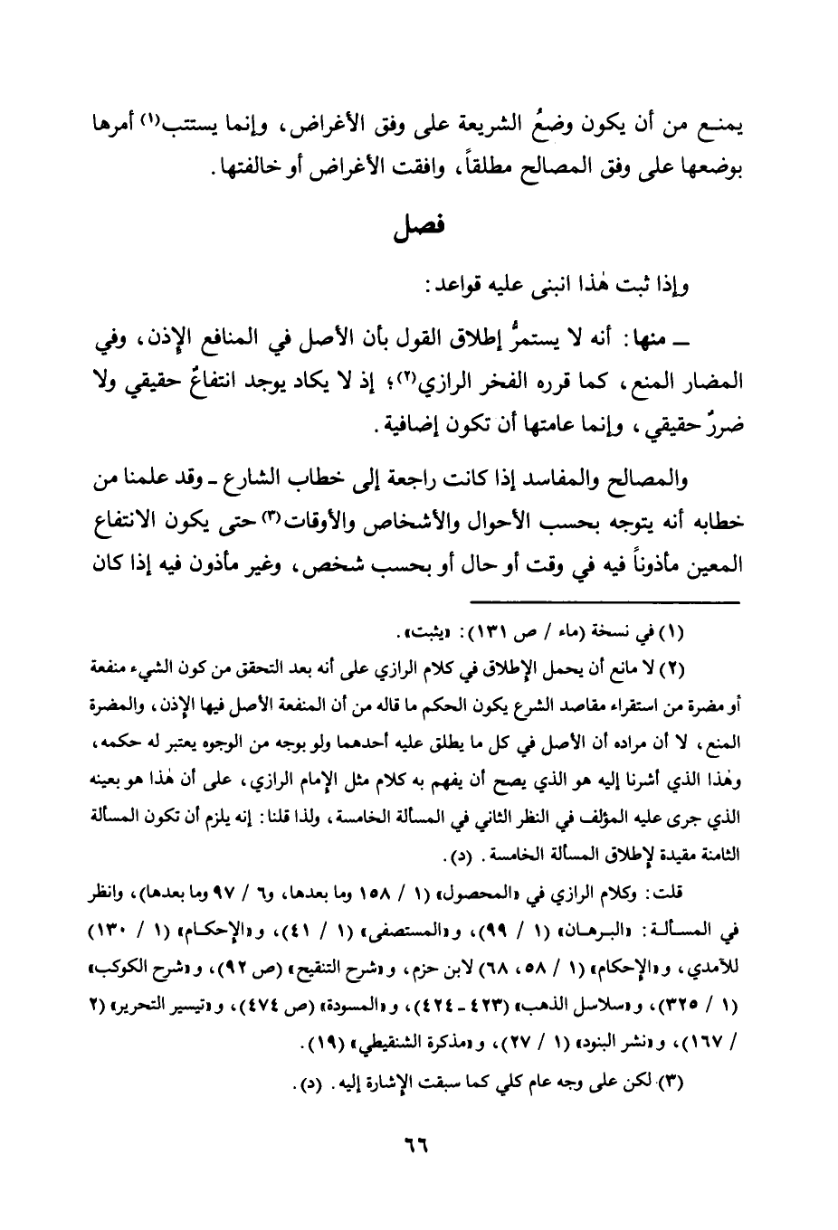 وَالْمَصَالِحُ وَالْمَفَاسِدُ إِذَا كَانَتْ رَاجِعَةً إِلَى خِطَابِ الشَّارِعِ -وَقَدْ عَلِمْنَا مِنْ خِطَابِهِ أَنَّهُ يَتَوَجَّهُ بِحَسَبِ الْأَحْوَالِ وَالْأَشْخَاصِ وَالْأَوْقَاتِ3 حَتَّى يَكُونَ الِانْتِفَاعُ الْمُعَيَّنُ مَأْذُونًا فِيهِ فِي وَقْتٍ أَوْ حَالٍ أَوْ بِحَسَبِ شَخْصٍ، وَغَيْرَ مَأْذُونٍ فِيهِ إِذَا كَانَ