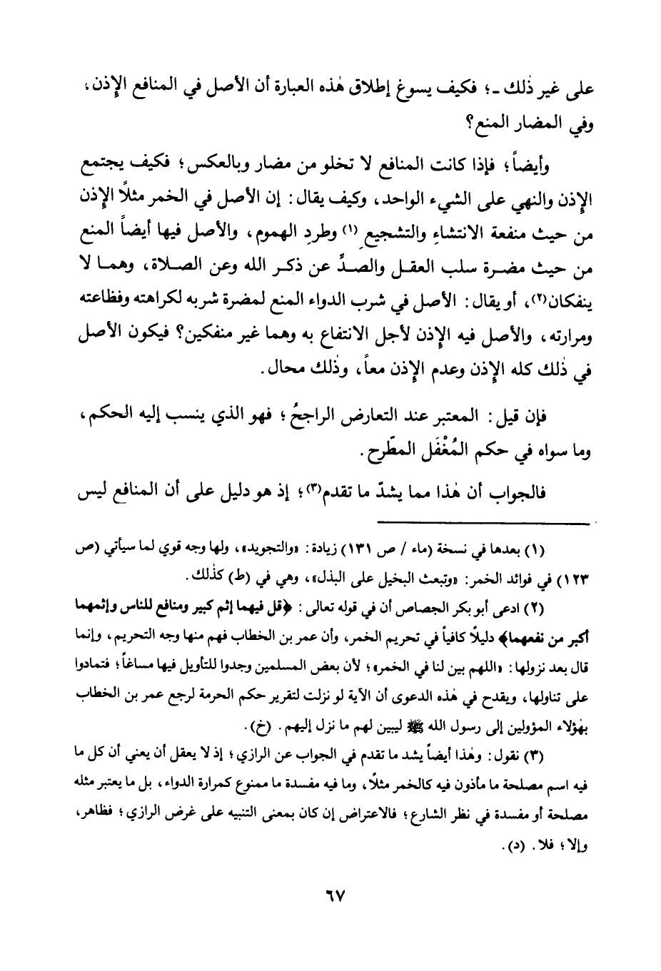 3 نقول: وهذا أيضًا يشد ما تقدم في الجواب عن الرازي، إذ لا يعقل أن يعني أن كل ما فيه اسم مصلحة ما مأذون فيه كالخمر مثلا، وما فيه مفسدة ما ممنوع كمرارة الدواء، بل ما يعتبر مثله مصلحة أو مفسدة في نظر الشارع، فالاعتراض إن كان بمعنى التنبيه على غرض الرازي، فظاهر، وإلا فلا. "د".