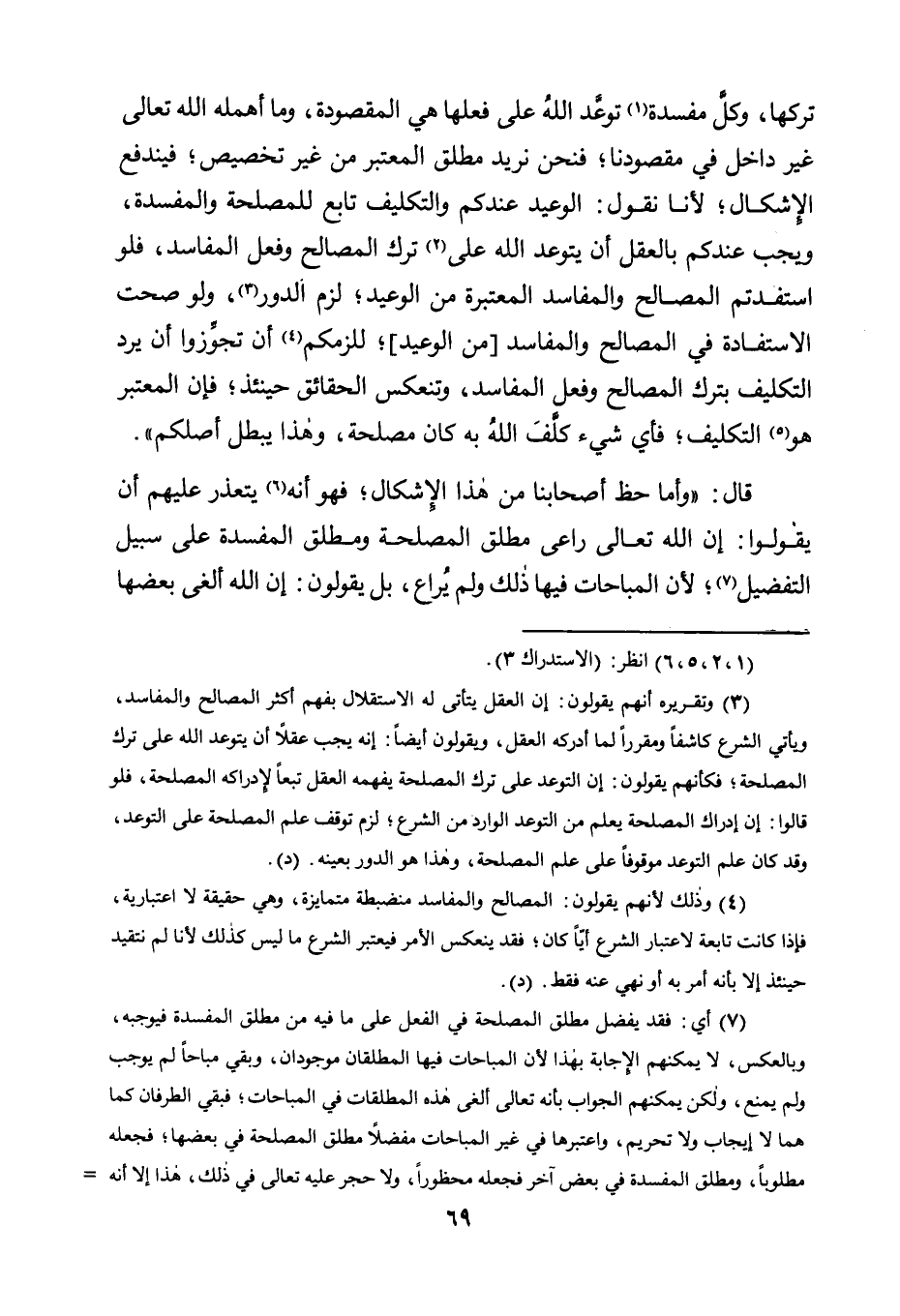 3 وتقريره أنهم يقولون: إن العقل يتأتى له الاستقلال بفهم أكثر المصالح والمفاسد، ويأتي الشرع كاشفا ومقررا لما أدركه العقل، ويقولون أيضا: إنه يجب عقلا أن يتوعد الله على ترك المصلحة، فكأنهم يقولون: إن التوعد على ترك المصلحة يفهمه العقل تبعا لإدراكه المصلحة، فلو قالوا: إن إدراك المصلحة يعلم من التوعد الوارد من الشرع، لزم توقف علم المصلحة على التوعد، وقدكان علم التوعد موقوفا على علم المصلحة، وهذا هو الدور بعينه. "د".