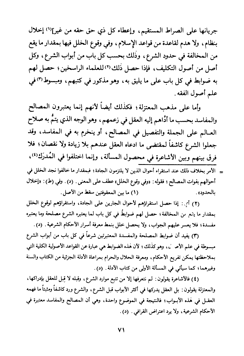 4 فالأشاعرة يقولون: لم نتعرفها إلا من تتبع موارد الشرع، وقبله لا قبل للعقل بإدراكها والمعتزلة يقولون: بل العقل يدركها في أكثر الأبواب قبل الشرع، والشرع ورد كاشفا ومثبتًا ما فهمه العقل في هذه الأبواب، فالنتيجة في الموضوع واحدة، وهي أن المصالح والمفاسد معتبرة في الأحكام الشرعية، ولا يرد اعتراض القرافي. "د".