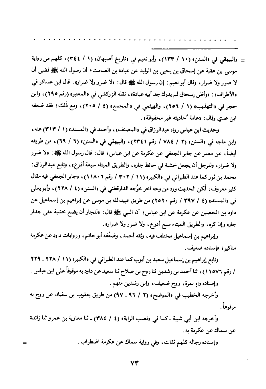 وحديث ابن عباس رواه عبد الرزاق في "المصنف" وأحمد في "المسند" "1/ 313" عنه وابن ماجه في "السنن" "2/ 784/ 2341"، والبيهقي في "السنن" "6/ 69"، من طريقه أيضًا، عن معمر عن جابر الجعفي عن عكرمة عن ابن عباس: قال: قال رسول الله صلى الله عليه وسلم: "لا ضرر ولا ضرار، وللرجل أن يجعل خشبة في حائط جاره، والطريق الميتاء سبعة أذرع"، وتابع عبد الرزاق: محمد بن ثور كما عند الطبراني في "الكبير" "11/ 302/ رقم 11806"، وجابر الجعفي فيه مقال كثير معروف، لكن الحديث ورد من وجه آخر خرجه "الدارقطني في "السنن" "4/ 228"، وأبو يعلى في "المسند" "4/ 397/ رقم 2520" من طريق عبيد الله بن موسى عن إبراهيم بن إسماعيل، عن داود بن الحصين، عن عكرمة، عن ابن عباس، أن النبي صلى الله عليه وسلم قال: "للجار أن يضع خشبة على جدار جاره وإن كره، والطريق الميتاء سبع أذرع، ولا ضرر ولا ضرار".