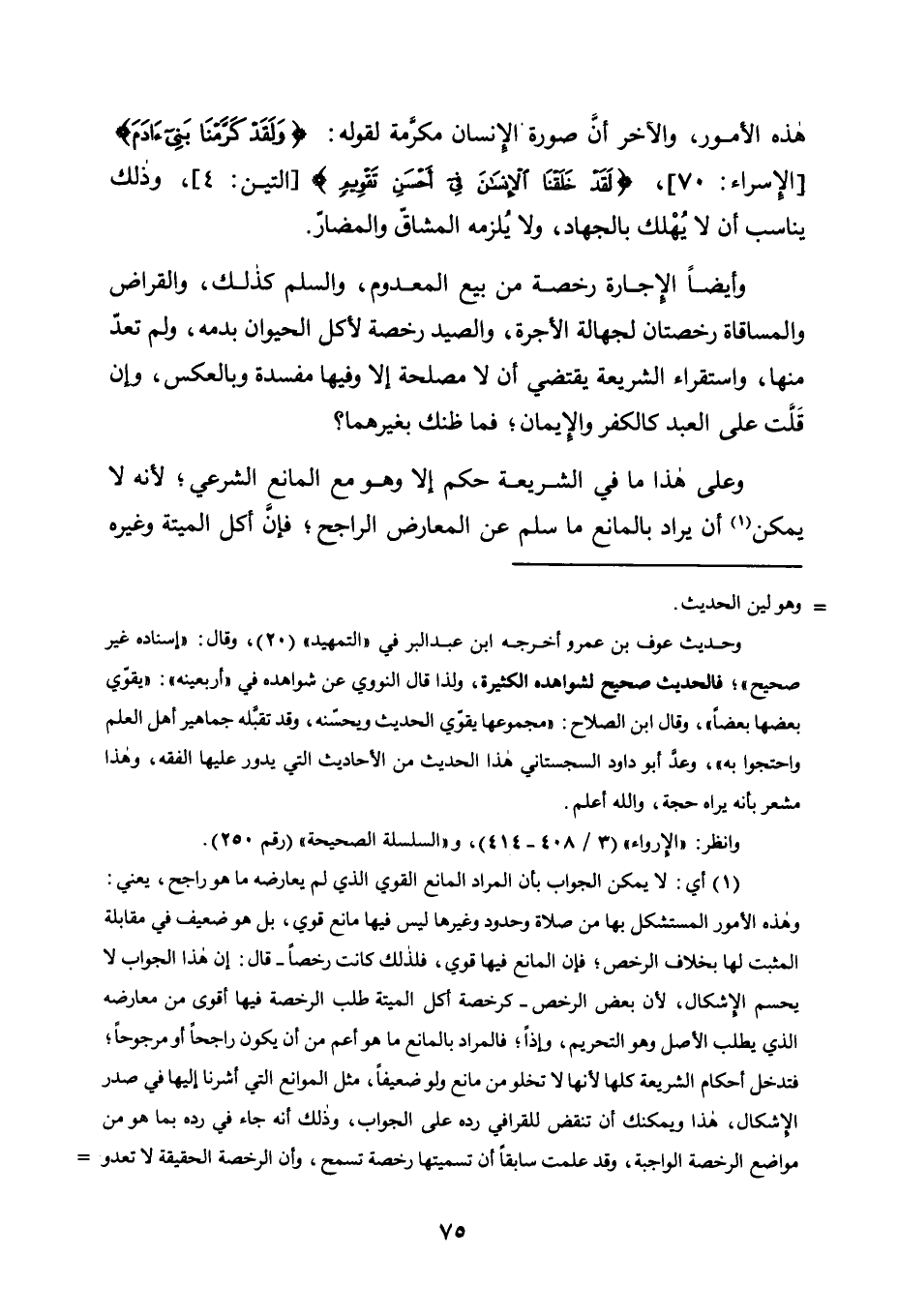 1 أي: لا يمكن الجواب بأن المراد المانع القوي الذي لم يعارضه ما هو راجح، يعني: وهذه الأمور المستشكل بها من صلاة وحدود وغيرها ليس فيها مانع قوي، بل هو ضعيف في مقابلة المثبت لها بخلاف الرخص، فإن المانع فيها قوي، فذلك كانت رخصا -قال: إن هذا الجواب لا يحسم الإشكال؛ لأن بعض الرخص- كرخصة أكل الميتة طلب الرخصة فيها أقوى من معارضه الذي يطلب الأصل وهو التحريم، وإذا، فالمراد بالمانع ما هو أعم من أن يكون راجحا أو مرجوحا، فتدخل أحكام الشريعة كلها؛ لأنها لا تخلو من مانع ولو ضعيفا، مثل الموانع التي أشرنا إليها في صدر الإشكال، هذا ويمكنك أن