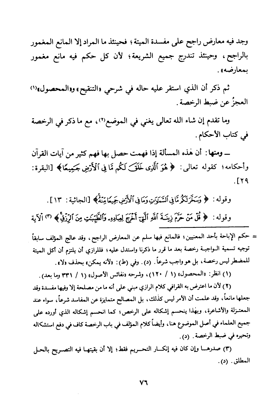 وُجِدَ فِيهِ مُعَارِضٌ رَاجِحٌ عَلَى مَفْسَدَةِ الْمَيْتَةِ، فَحِينَئِذٍ مَا الْمُرَادُ إِلَّا الْمَانِعُ الْمَغْمُورُ بِالرَّاجِحِ، وَحِينَئِذٍ تَنْدَرِجُ جَمِيعُ الشَّرِيعَةِ؛ لِأَنَّ كُلَّ حُكْمٍ فِيهِ مَانِعٌ مَغْمُورٌ بِمُعَارِضِهِ".