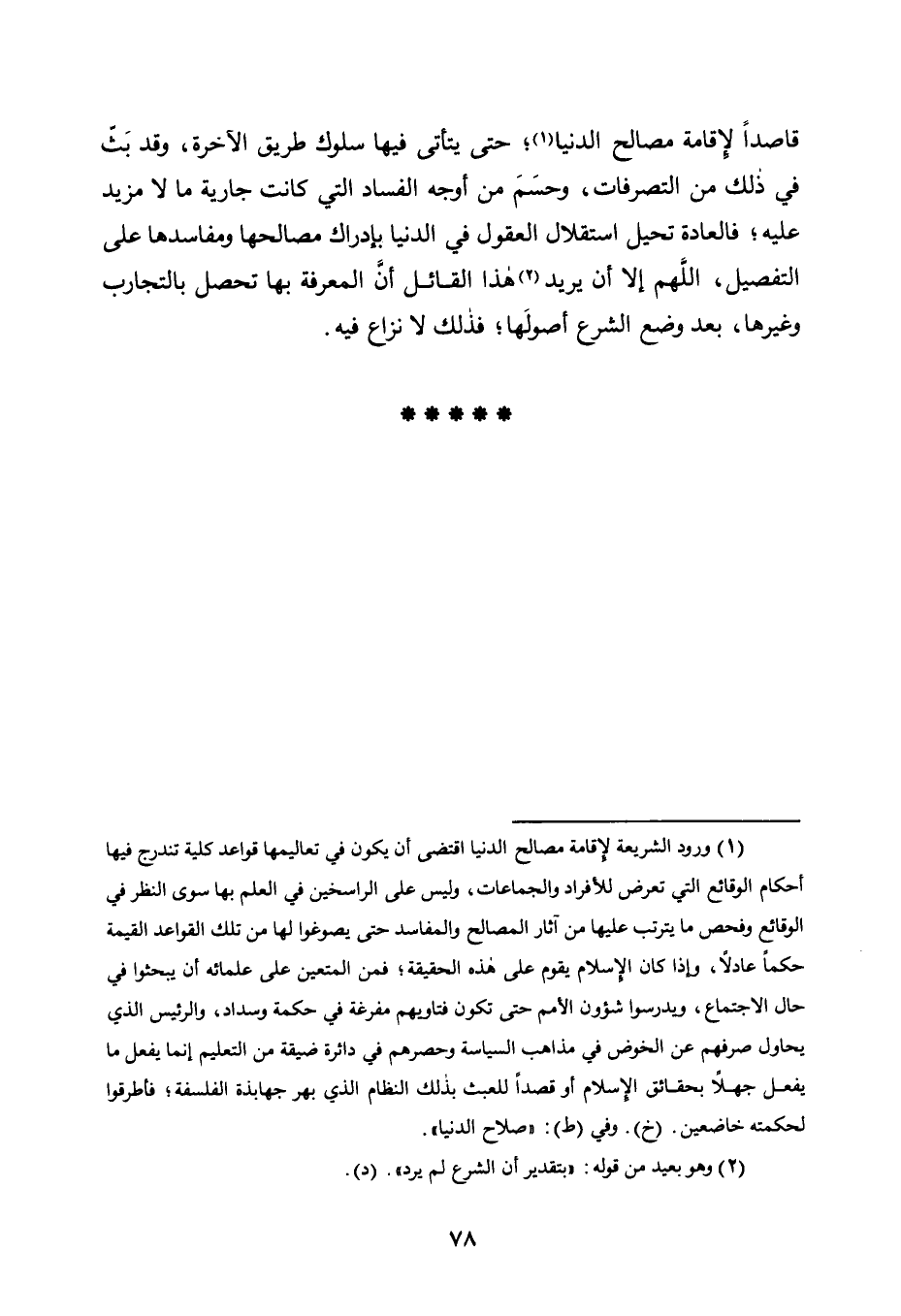 1 ورود الشريعة لإقامة مصالح الدنيا اقتضى أن يكون في تعاليمها قواعد كلية تندرج فيها أحكام الوقائع التي تعرض للأفراد والجماعات، وليس على الراسخين في العلم بها سوى النظر في الوقائع وفحص ما يترتب عليها من آثار المصالح والمفاسد حتى يصوغوا لها من تلك القواعد القيمة حكما عادلا، وإذا كان الإسلام يقوم على هذه الحقيقة، فمن المتعين على علمائه أن يبحثوا في حال الاجتماع، ويدرسوا شؤون الأمم حتى تكون فتاويهم مفرغة في حكمه وسداد، والرئيس الذي يحاول صرفهم عن الخوض في مذاهب السياسة وحصرهم في دائرة ضيقة من التعليم إنما يفعل ما يفعل جهلا بحقائق الإسلام أو قصدًا للعبث بذلك النظام الذي بهر جهابذة الفلسفة، فأطرقوا لحكمته خاضعين. "خ". وفي "ط": "صلاح الدنيا".
