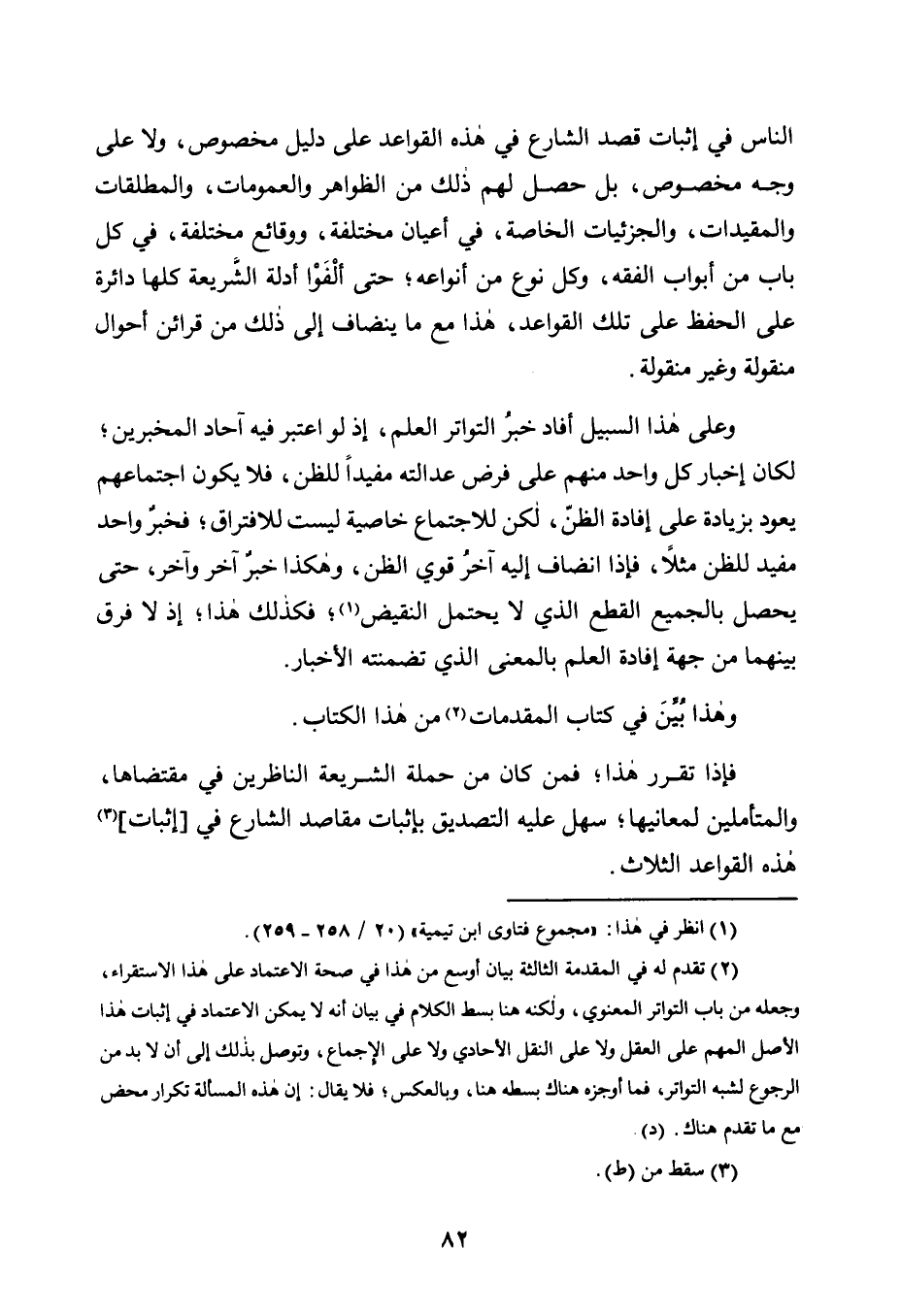 2 تقدم له في المقدمة الثالثة بيان أوسع من هذا في صحة الاعتماد على هذا الاستقراء، وجعله من باب التواتر المعنوي، ولكنه هنا بسط الكلام في بيان أنه لا يمكن الاعتماد في إثبات هذا الأصل المهم على العقل ولا على النقل الأحادي ولا على الإجماع، وتوصل ذلك إلى أن لا بد من الرجوع لشبه التواتر، فما أوجزه هناك بسطه هنا، وبالعكس، فلا يقال: إن هذه المسألة تكرار محض مع ما تقدم هناك. "د".
