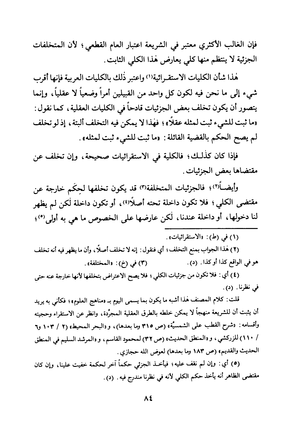 هَذَا شَأْنُ الْكُلِّيَّاتِ الِاسْتِقْرَائِيَّةِ1 وَاعْتُبِرَ ذَلِكَ بِالْكُلِّيَّاتِ الْعَرَبِيَّةِ فَإِنَّهَا أَقْرَبُ شَيْءٍ إِلَى مَا نَحْنُ فِيهِ لِكَوْنِ كُلِّ وَاحِدٍ مِنَ الْقَبِيلَيْنِ أَمْرًا وَضْعِيًّا لَا عَقْلِيًّا، وَإِنَّمَا يُتَصَوَّرُ أَنْ يَكُونَ تَخَلُّفُ بَعْضِ الْجُزْئِيَّاتِ قَادِحًا فِي الْكُلِّيَّاتِ الْعَقْلِيَّةِ، كَمَا نَقُولُ: "مَا ثَبَتَ لِلشَّيْءِ ثَبَتَ لِمِثْلِهِ عَقْلًا"، فَهَذَا لَا يُمْكِنُ فِيهِ التَّخَلُّفُ أَلْبَتَّةَ، إِذْ لَوْ تَخَلَّفَ لَمْ يَصِحَّ الْحُكْمُ بِالْقَضِيَّةِ الْقَائِلَةِ: "مَا ثَبَتَ لِلشَّيْءِ ثَبَتَ لِمِثْلِهِ".