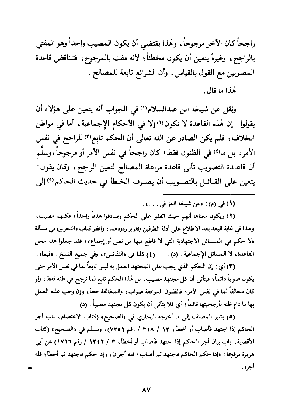 وَنَقَلَ عَنْ شَيْخِهِ ابْنِ عَبْدِ السَّلَامِ1 فِي الْجَوَابِ أنه يتعين على هؤلاء أن يقولوا: عن هَذِهِ الْقَاعِدَةَ لَا تَكُونُ2 إِلَّا فِي الْأَحْكَامِ الْإِجْمَاعِيَّةِ، أَمَّا فِي مَوَاطِنِ الْخِلَافِ، فَلَمْ يَكُنِ الصَّادِرُ عَنِ اللَّهِ تَعَالَى أَنَّ الْحُكْمَ تَابِعٌ3 للراجح في نفس الأمر، بل ما4 فِي الظُّنُونِ فَقَطْ، كَانَ رَاجِحًا فِي نَفْسِ الْأَمْرِ أَوْ مَرْجُوحًا، وَسُلِّمَ أَنَّ قَاعِدَةَ التَّصْوِيبِ تَأْبَى قَاعِدَةَ مُرَاعَاةِ الْمَصَالِحِ لِتُعِينَ الرَّاجِحَ، وَكَانَ يَقُولُ يَتَعَيَّنُ عَلَى الْقَائِلِ بِالتَّصْوِيبِ أَنْ يَصْرِفَ الخطأ في حديث الحاكم5 إلى
