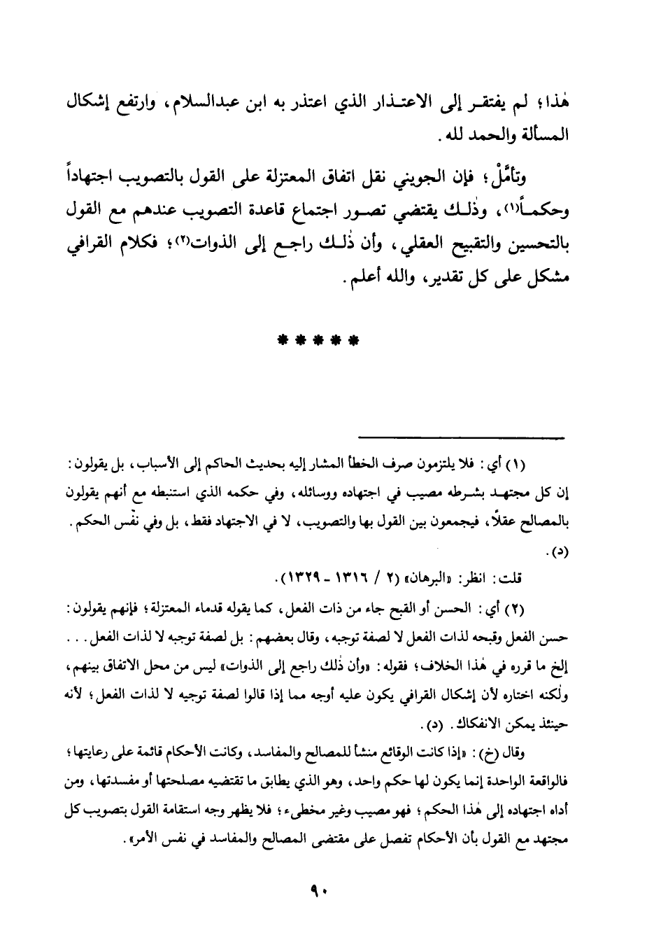 وَتَأَمَّلْ، فَإِنَّ الْجُوَيْنِيَّ نَقَلَ اتِّفَاقَ الْمُعْتَزِلَةِ عَلَى الْقَوْلِ بِالتَّصْوِيبِ اجْتِهَادًا وَحُكْمًا1، وَذَلِكَ يَقْتَضِي تَصَوُّرَ اجْتِمَاعِ قَاعِدَةِ التَّصْوِيبِ عِنْدَهُمْ مَعَ الْقَوْلِ بِالتَّحْسِينِ وَالتَّقْبِيحِ الْعَقْلِيِّ، وَأَنَّ ذَلِكَ رَاجِعٌ إِلَى الذَّوَاتِ2، فَكَلَامُ الْقَرَافِيِّ مُشْكِلٌ عَلَى كُلِّ تقدير، والله أعلم