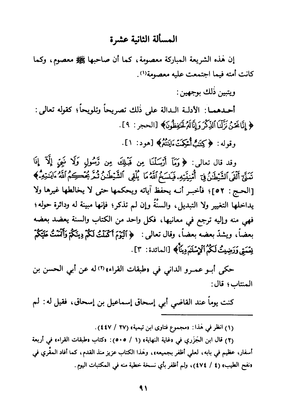 الْأَدِلَّةُ الدَّالَّةُ عَلَى ذَلِكَ تَصْرِيحًا وَتَلْوِيحًا، كَقَوْلِهِ تَعَالَى: {إِنَّا نَحْنُ نَزَّلْنَا الذِّكْرَ وَإِنَّا لَهُ لَحَافِظُونَ} [الْحِجْرِ: 9] وَقَوْلِهِ {كِتَابٌ أُحْكِمَتْ آيَاتُهُ} [هُودٍ: 1] .