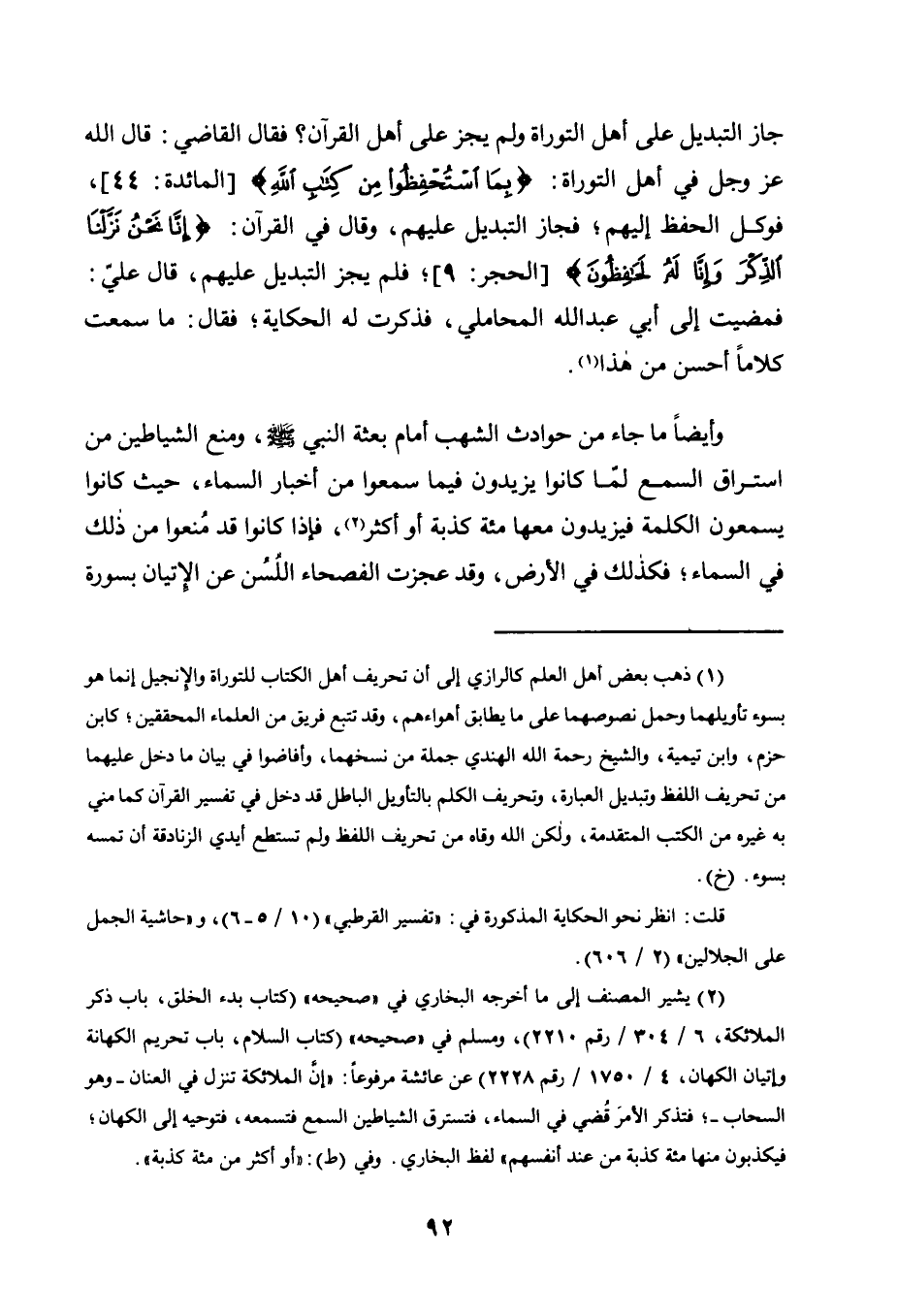 1 ذهب بعض أهل العلم كالرازي إلى أن تحريف أهل الكتاب للتوراة والإنجيل إنما هو بسوء تأويلهما وحمل نصوصهما على ما يطابق أهواءهم، وقد تتبع فريق من العلماء المحققين، كابن حزم، وابن تيمية، والشيخ رحمة الله الهندي جملة من نسخهما، وأفاضوا في بيان ما دخل عليها من تحريف اللفظ وتبديل العبارة، وتحريف الكلم بالتأويل الباطل قد دخل في تفسير القرآن كما مني به غيره من الكتب المتقدمة، ولكن الله وقاه من تحريف اللفظ، ولم تستطع أيدي الزنادقة أن تمسه بسوء. "خ".