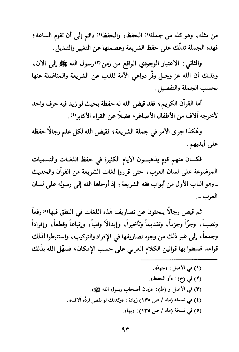 ثم قيض رجالا يبحثون يَبْحَثُونَ عَنْ تَصَارِيفِ هَذِهِ اللُّغَاتِ فِي النُّطْقِ فِيهَا5 رَفْعًا وَنَصْبًا، وَجَرًّا وَجَزْمًا، وَتَقْدِيمًا وَتَأْخِيرًا، وَإِبْدَالًا وَقَلْبًا، وَإِتْبَاعًا وَقَطْعًا، وَإِفْرَادًا وَجَمْعًا، إِلَى غَيْرِ ذَلِكَ مِنْ وُجُوهِ تَصَارِيفِهَا فِي الْإِفْرَادِ وَالتَّرْكِيبِ، وَاسْتَنْبَطُوا لِذَلِكَ قَوَاعِدَ ضَبَطُوا بِهَا قَوَانِينَ الْكَلَامِ الْعَرَبِيِّ عَلَى حَسَبِ الْإِمْكَانِ، فَسَهَّلَ اللَّهُ بذلك.