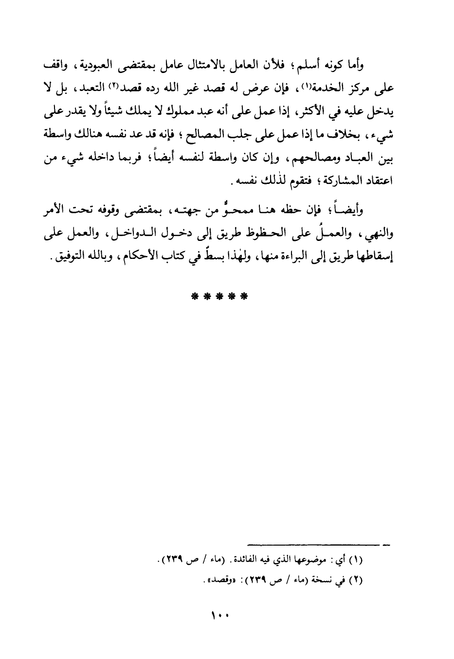 وَأَيْضًا؛ فَإِنَّ حَظَّهُ هُنَا مَمْحُوٌّ مِنْ جِهَتِهِ، بِمُقْتَضَى وُقُوفِهِ تَحْتَ الْأَمْرِ وَالنَّهْيِ، وَالْعَمَلُ عَلَى الْحُظُوظِ طَرِيقٌ إِلَى دُخُولِ الدَّوَاخِلِ، وَالْعَمَلُ عَلَى إِسْقَاطِهَا طَرِيقٌ إِلَى الْبَرَاءَةِ مِنْهَا، وَلِهَذَا بسط في كتاب الأحكام، وبالله التوفيق.