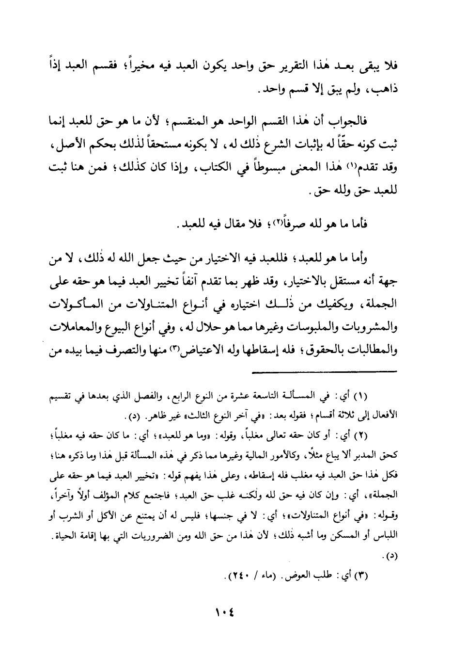 وَأَمَّا مَا هُوَ لِلْعَبْدِ؛ فَلِلْعَبْدِ فِيهِ الِاخْتِيَارُ مِنْ حَيْثُ جَعَلَ اللَّهُ لَهُ ذَلِكَ، لَا مِنْ جِهَةِ أَنَّهُ مُسْتَقِلٌّ بِالِاخْتِيَارِ، وَقَدْ ظَهَرَ بِمَا تَقَدَّمَ آنِفًا تَخْيِيرُ الْعَبْدِ فِيمَا هُوَ حَقُّهُ عَلَى الْجُمْلَةِ، وَيَكْفِيكَ مِنْ ذَلِكَ اخْتِيَارُهُ فِي أَنْوَاعِ الْمُتَنَاوَلَاتِ مِنَ الْمَأْكُولَاتِ وَالْمَشْرُوبَاتِ وَالْمَلْبُوسَاتِ وَغَيْرِهَا مِمَّا هُوَ حَلَالٌ لَهُ، وَفِي أَنْوَاعِ الْبُيُوعِ وَالْمُعَامَلَاتِ وَالْمُطَالَبَاتِ بِالْحُقُوقِ؛ فَلَهُ إِسْقَاطُهَا وَلَهُ الِاعْتِيَاضُ3 منها والتصرف فيما بيده من