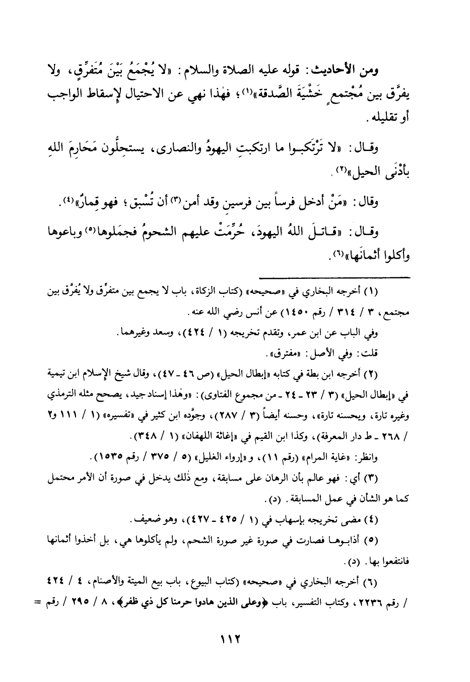 وَمِنَ الْأَحَادِيثِ: قَوْلُهُ عَلَيْهِ الصَّلَاةُ وَالسَّلَام: "لَا يجمع بين متفرق ولا يفرق بن مُجْتَمِعٍ خَشْيَةَ الصَّدَقَةِ" 1؛ فَهَذَا نَهْيٌ عَنِ الِاحْتِيَالِ لِإِسْقَاطِ الْوَاجِبِ أَوْ تَقْلِيلِهِ.