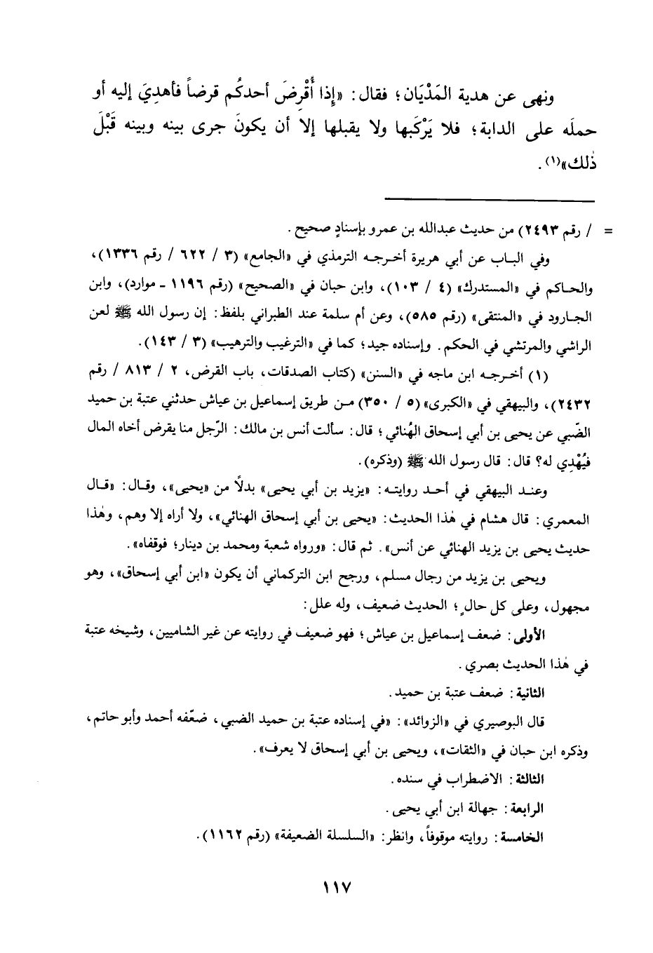 1 أخرجه ابن ماجه في "السنن" "كتاب الصدقات، باب القرض، 2/ 813/ رقم 2432"، والبيهقي في الكبرى" "5/ 350" من طريق إسماعيل بن عياش حدثني عتبة بن حميد الضبي عن يحيى بن أبي إسحاق الهنائي؛ قال: سألت أنس بن مالك: الرجل منا يقرض أخاه المال فيهدي له؟ قال: قال رسول الله صلى الله عليه وسلم: "وذكره".