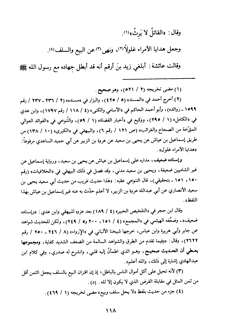 2 أخرج أحمد في "المسند" "5/ 425"، والبزار في "مسنده" "2/ 236-237/ رقم 1599- زوائده"، وأبو أحمد الحاكم في "الأسامي والكنى" "4/ 118/ رقم 1797"، وابن عدي في "الكامل" "1/ 295"، ووكيع في "أخبار القضاة" "1/ 59"، والتنوخي في "الفوائد العوالي المؤرخة من الصحاح والغرائب" "ص121/ رقم 6"، والبيهقي في "الكبرى" "10/ 138" من طريق إسماعيل بن عياش عن يحيى بن سعيد عن عروة بن الزبير عن أبي حميد الساعدي مرفوعا: "هدايا الأمراء غلول".