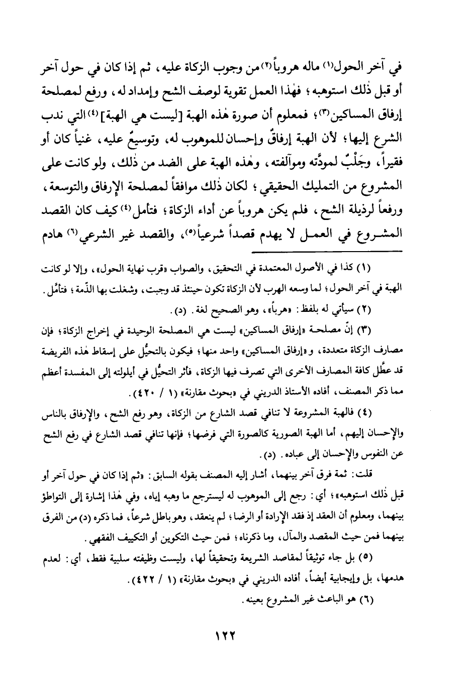 4 فالهبة المشروعة لا تنافي قصد الشارع من الزكاة، وهو رفع الشح، والإرفاق بالناس والإحسان إليهم، أما الهبة الصورية كالصورة التي فرضها؛ فإنها تنافي قصد الشارع في رفع الشح عن النفوس والإحسان إلى عباده. "د".