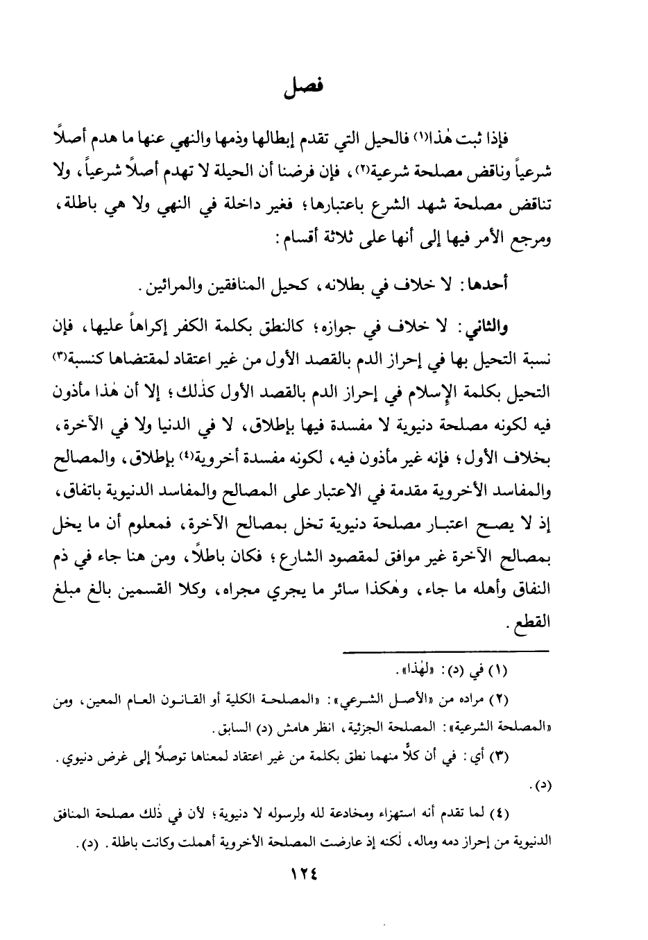 لَا خِلَافَ فِي جَوَازِهِ؛ كَالنُّطْقِ بِكَلِمَةِ الْكُفْرِ إِكْرَاهًا عَلَيْهَا، فَإِنَّ نِسْبَةَ التَّحَيُّلِ بِهَا فِي إِحْرَازِ الدَّمِ بِالْقَصْدِ الْأَوَّلِ مِنْ غَيْرِ اعْتِقَادٍ لِمُقْتَضَاهَا كَنِسْبَةِ3 التَّحَيُّلِ بِكَلِمَةِ الْإِسْلَامِ فِي إِحْرَازِ الدَّمِ بِالْقَصْدِ الْأَوَّلِ كَذَلِكَ؛ إِلَّا أَنَّ هَذَا مَأْذُونٌ فِيهِ لِكَوْنِهِ مَصْلَحَةً دُنْيَوِيَّةً لَا مَفْسَدَةَ فِيهَا بِإِطْلَاقٍ، لَا فِي الدُّنْيَا وَلَا فِي الْآخِرَةِ، بِخِلَافِ الْأَوَّلِ؛ فَإِنَّهُ غَيْرُ مَأْذُونٍ فِيهِ، لِكَوْنِهِ مَفْسَدَةً أُخْرَوِيَّةً4 بِإِطْلَاقٍ، وَالْمَصَالِحُ وَالْمَفَاسِدُ الْأُخْرَوِيَّةُ مُقَدَّمَةٌ فِي الِاعْتِبَارِ عَلَى الْمَصَالِحِ وَالْمَفَاسِدِ الدُّنْيَوِيَّةِ بِاتِّفَاقٍ، إِذْ لَا يَصِحُّ اعْتِبَارُ مَصْلَحَةٍ دُنْيَوِيَّةٍ تُخِلُّ بِمَصَالِحِ الْآخِرَةِ، فَمَعْلُومٌ أَنَّ مَا يُخِلُّ بِمَصَالِحِ الْآخِرَةِ غَيْرُ مُوَافِقٍ لِمَقْصُودِ الشَّارِعِ؛ فَكَانَ بَاطِلًا، وَمِنْ هُنَا جَاءَ فِي ذَمِّ النِّفَاقِ وَأَهْلِهِ مَا جَاءَ، وَهَكَذَا سَائِرُ مَا يَجْرِي مَجْرَاهُ، وَكِلَا القسمين بالغ مبلغ القطع.