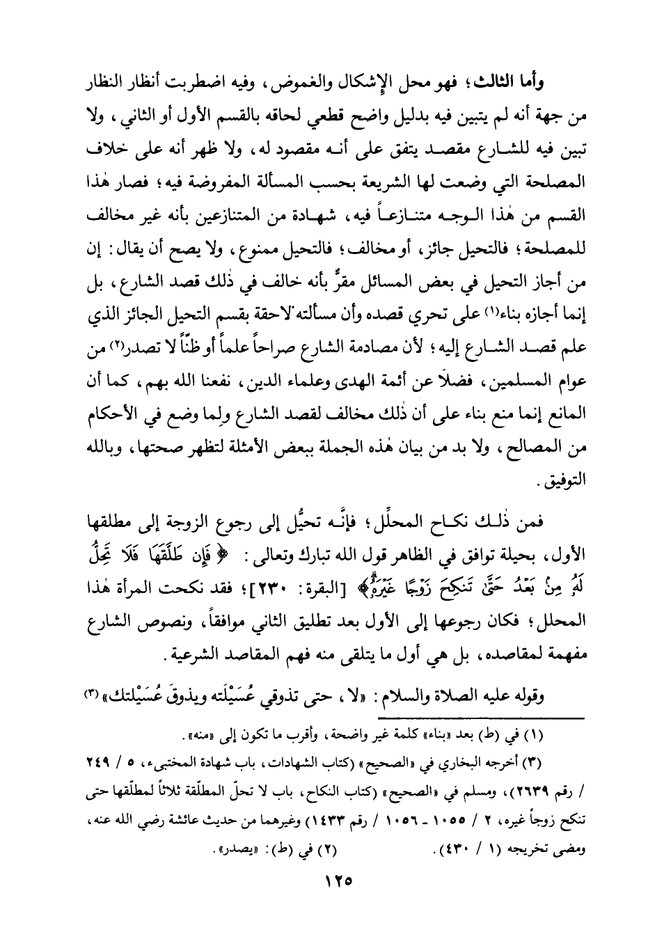هو مَحَلُّ الْإِشْكَالِ وَالْغُمُوضِ، وَفِيهِ اضْطَرَبَتْ أَنْظَارُ النُّظَّارِ مِنْ جِهَةِ أَنَّهُ لَمْ يَتَبَيَّنْ فِيهِ بِدَلِيلٍ وَاضِحٍ قَطْعِيٍّ لِحَاقُهُ بِالْقِسْمِ الْأَوَّلِ أَوِ الثَّانِي، وَلَا تَبَيَّنَ فِيهِ لِلشَّارِعِ مَقْصِدٌ يُتَّفَقُ عَلَى أَنَّهُ مَقْصُودٌ لَهُ، وَلَا ظَهَرَ أَنَّهُ عَلَى خِلَافِ الْمَصْلَحَةِ الَّتِي وُضِعَتْ لَهَا الشَّرِيعَةُ بِحَسَبِ الْمَسْأَلَةِ الْمَفْرُوضَةِ فِيهِ؛ فَصَارَ هَذَا الْقِسْمُ مِنْ هَذَا الْوَجْهِ مُتَنَازَعًا فِيهِ، شَهَادَةٌ مِنَ الْمُتَنَازِعِينَ بِأَنَّهُ غَيْرُ مُخَالِفٍ لِلْمَصْلَحَةِ؛ فَالتَّحَيُّلُ جَائِزٌ، أَوْ مُخَالِفٌ؛ فَالتَّحَيُّلُ مَمْنُوعٌ، وَلَا يَصِحُّ أَنْ يُقَالَ: إِنَّ مَنْ أَجَازَ التَّحَيُّلَ فِي بَعْضِ الْمَسَائِلِ مُقِرٌّ بِأَنَّهُ خَالَفَ فِي ذَلِكَ قَصْدَ الشَّارِعِ، بَلْ إِنَّمَا أَجَازَهُ بِنَاءً1 عَلَى تَحَرِّي قَصْدِهِ وَأَنَّ مَسْأَلَتَهُ لَاحِقَةٌ بِقِسْمِ التَّحَيُّلِ الْجَائِزِ الَّذِي عُلِمَ قَصْدُ الشَّارِعِ إِلَيْهِ؛ لِأَنَّ مُصَادَمَةَ الشَّارِعِ صُرَاحًا عِلْمًا أَوْ ظَنًّا لَا تَصْدُرُ2 مِنْ عَوَامِّ الْمُسْلِمِينَ، فَضْلًا عَنْ أَئِمَّةِ الْهُدَى وَعُلَمَاءِ الدِّينِ، نَفَعَنَا اللَّهُ بِهِمْ، كَمَا أَنَّ الْمَانِعَ إِنَّمَا مَنَعَ بِنَاءً عَلَى أَنَّ ذَلِكَ مُخَالِفٌ لِقَصْدِ الشَّارِعِ وَلِمَا وُضِعَ فِي الْأَحْكَامِ مِنَ الْمَصَالِحِ، وَلَا بُدَّ مِنْ بَيَانِ هَذِهِ الْجُمْلَةِ بِبَعْضِ الْأَمْثِلَةِ لِتَظْهَرَ صِحَّتُهَا، وَبِاللَّهِ التَّوْفِيقُ.