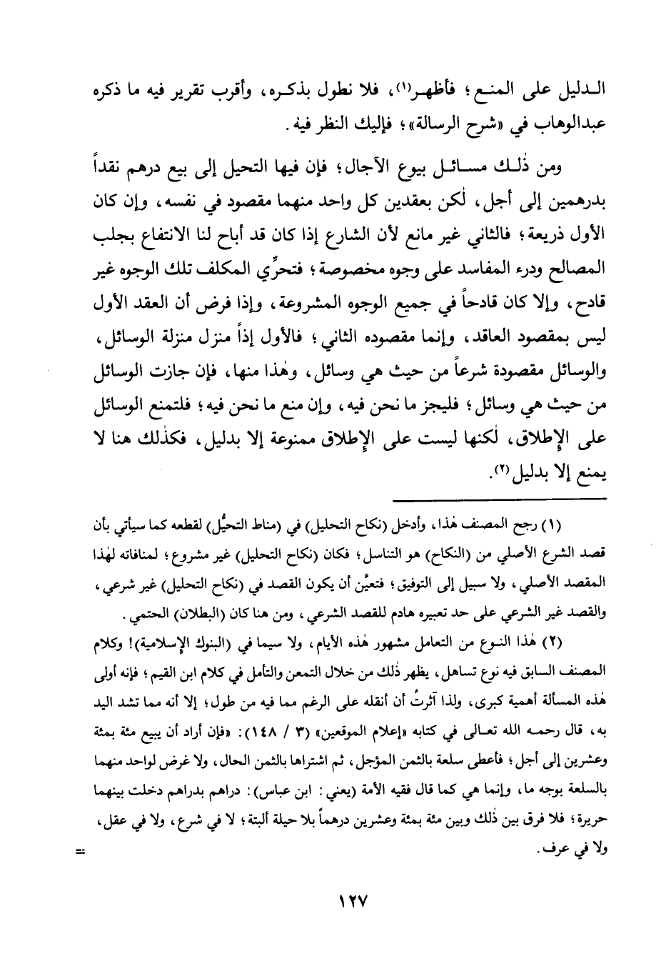 2 هذا النوع من التعامل مشهور هذه الأيام، ولا سيما في "البنوك الإسلامية"! وكلام المصنف السابق فيه نوع تساهل، يظهر ذلك من خلال التمعن والتأمل في كلام ابن القيم، فإنه أولى هذه المسألة أهمية كبرى، ولذا آثرت أن أنقله على الرغم مما فيه من طول؛ إلا أنه مما تشد اليد به، قال رحمه الله تعالى في كتابه "إعلام الموقعين" "3/ 148": "فإن أراد أن يبيع مائة بمائة وعشرين إلى أجل؛ فأعطى سلعة بالثمن المؤجل، ثم اشتراها بالثمن الحال، ولا غرض لواحد منهما بالسلعة بوجه ما، وإنما هي كما قال فقيه الأمة "يعني: ابن عباس": دراهم بدراهم دخلت بينهما حريرة؛ فلا فرق بين ذلك وبين مائة بمائة وعشرين درهما بلا حيلة ألبتة؛ لا في شرع، ولا في عقل، ولا في عرف. =