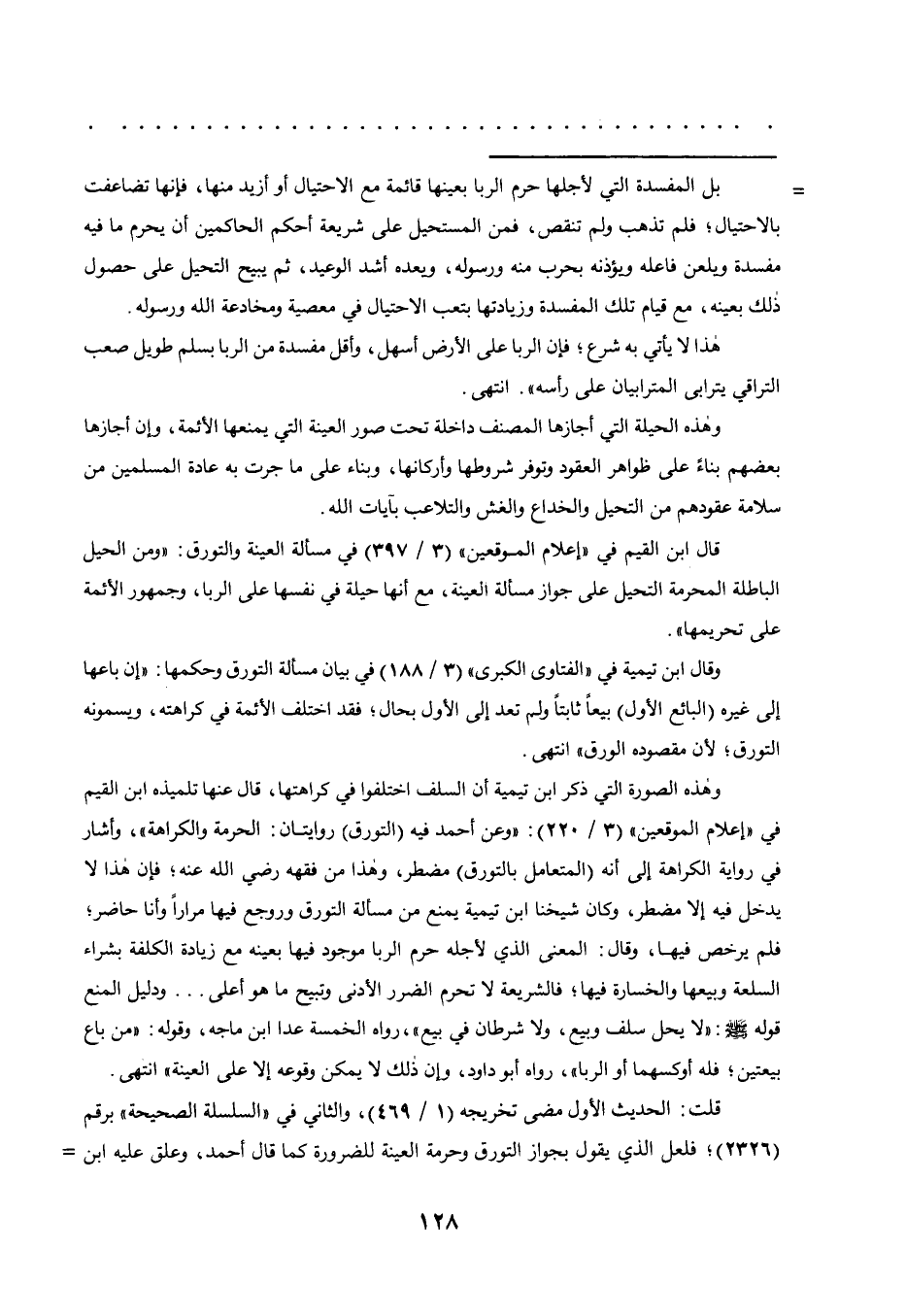 = بل المفسدة التي لأجلها حرم الربا بعينها قائمة مع الاحتيال أو أزيد منها، فإنها تضاعفت بالاحتيال؛ فلم تذهب ولم تنقص، فمن المستحيل على شريعة أحكم الحاكمين أن يحرم ما فيه مفسدة ويلعن فاعله ويؤذنه بحرب منه ورسوله، ويعده أشد الوعيد، ثم يبيح التحيل على حصول ذلك بعينه، مع قيام تلك المفسدة وزيادتها بتعب الاحتيال في معصية ومخادعة الله ورسوله.