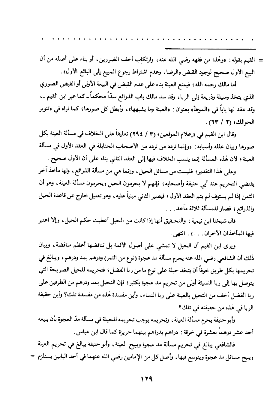 ويرى ابن القيم أن الحيل لا تمشي على أصول الأئمة بل تناقضها أعظم مناقضة، وبيان ذلك أن الشافعي رضي الله عنه يحرم مسألة مُدّ عجوة "نوع من التمر" ودرهم بمد ودرهم، ويبالغ في تحريمها بكل طريق خوفًا أن يتخذ حيلة على نوع ما من ربا الفضل؛ فتحريمه للحيل الصريحة التي يتوصل بها إلى ربا النسيئة أولى من تحريم مد عجوة بكثير؛ فإن التحيل بمد ودرهم من الطرفين على ربا الفضل أخف من التحيل بالعينة على ربا النساء، وأين مفسدة هذه من مفسدة تلك؟ وأين حقيقة الربا في هذه من حقيقته في تلك؟