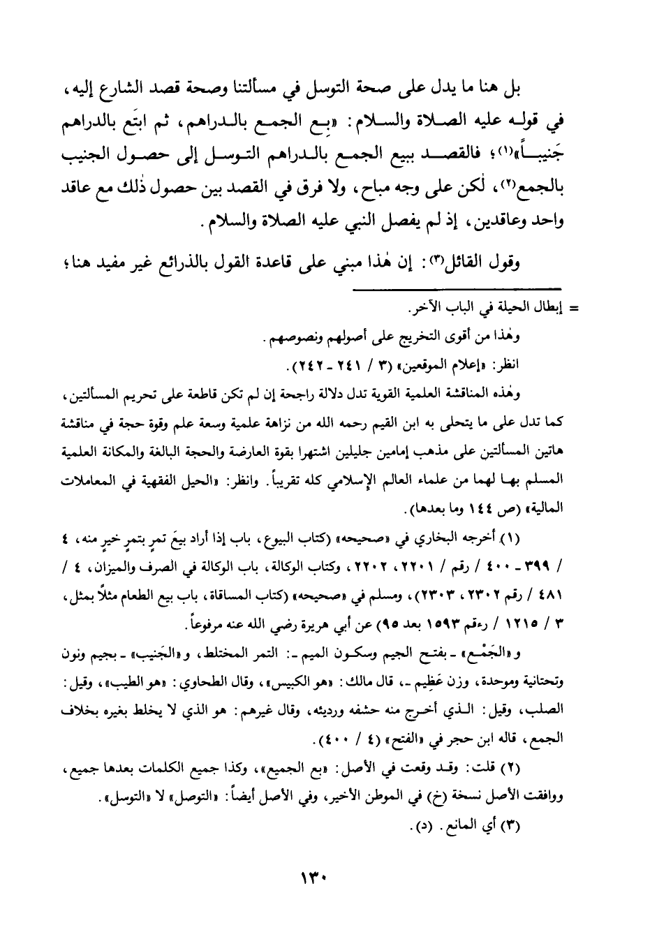بَلْ هُنَا مَا يَدُلُّ عَلَى صِحَّةِ التَّوَسُّلِ فِي مَسْأَلَتِنَا وَصِحَّةِ قَصْدِ الشَّارِعِ إِلَيْهِ، فِي قَوْلِهِ عَلَيْهِ الصَّلَاةُ وَالسَّلَامُ: "بِعِ الْجَمْعَ بِالدَّرَاهِمِ، ثُمَّ ابْتَعْ بِالدَّرَاهِمِ جَنِيبًا" 1؛ فَالْقَصْدُ بِبَيْعِ الْجَمْعِ بِالدَّرَاهِمِ التَّوَسُّلُ إِلَى حُصُولِ الْجَنِيبِ بِالْجَمْعِ2، لَكِنْ عَلَى وَجْهٍ مُبَاحٍ، وَلَا فَرْقَ فِي الْقَصْدِ بَيْنَ حُصُولِ ذَلِكَ مَعَ عَاقِدٍ وَاحِدٍ وَعَاقِدَيْنَ، إِذْ لَمْ يُفَصِّلُ النَّبِيُّ عَلَيْهِ الصَّلَاةُ وَالسَّلَامُ.