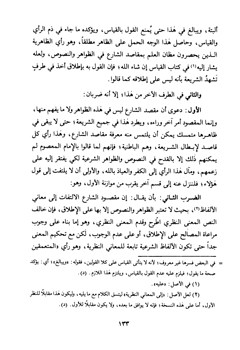 الْأَوَّلُ: دَعْوَى أَنَّ مَقْصِدَ الشَّارِعِ لَيْسَ فِي هَذِهِ الظَّوَاهِرِ وَلَا مَا يُفْهَمُ مِنْهَا وَإِنَّمَا الْمَقْصُودُ أَمْرٌ آخَرُ وَرَاءَهُ، وَيَطَّرِدُ هَذَا فِي جَمِيعِ الشَّرِيعَةِ؛ حَتَّى لَا يَبْقَى فِي ظَاهِرِهَا مُتَمَسَّكٌ يُمْكِنُ أَنْ يُلْتَمَسَ مِنْهُ مَعْرِفَةُ مَقَاصِدِ الشَّارِعِ، وَهَذَا رَأْيُ كُلِّ قَاصِدٍ لِإِبْطَالِ الشَّرِيعَةِ، وَهُمُ الْبَاطِنِيَّةُ؛ فَإِنَّهُمْ لَمَّا قَالُوا بِالْإِمَامِ الْمَعْصُومِ لَمْ يُمْكِنْهُمْ ذَلِكَ إِلَّا بِالْقَدْحِ فِي النُّصُوصِ وَالظَّوَاهِرِ الشَّرْعِيَّةِ لِكَيْ يُفْتَقَرَ إِلَيْهِ عَلَى زَعْمِهِمْ، وَمَآلُ هَذَا الرَّأْيِ إِلَى الْكُفْرِ وَالْعِيَاذُ بِاللَّهِ، وَالْأَوْلَى أَنْ لَا يُلْتَفَتَ إِلَى قَوْلِ هَؤُلَاءِ؛ فَلْنَنْزِلْ عَنْهُ إِلَى قِسْمٍ آخَرَ يُقَرِّبُ مِنْ مُوَازَنَةِ الْأَوَّلِ، وَهُوَ: