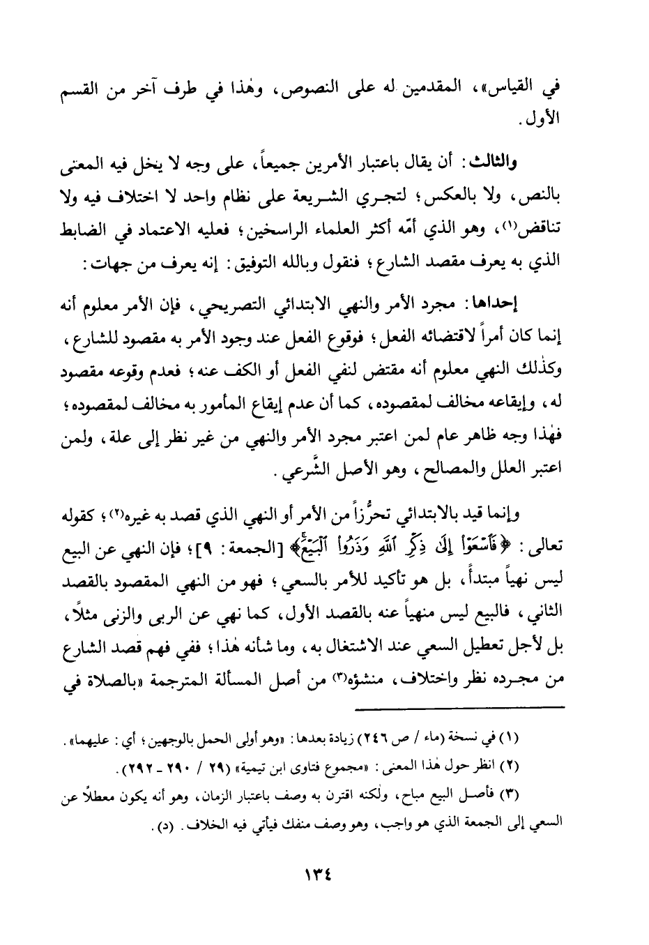وَإِنَّمَا قُيِّدَ بِالِابْتِدَائِيِّ تَحَرُّزًا مِنَ الْأَمْرِ أَوِ النَّهْيِ الَّذِي قُصِدَ بِهِ غَيْرُهُ2؛ كَقَوْلِهِ تَعَالَى: {فَاسَعَوْا إِلَى ذِكْرِ اللَّهِ وَذَرُوا الْبَيْعَ} [الْجُمْعَةِ: 9] ؛ فَإِنَّ النَّهْيَ عَنِ الْبَيْعِ لَيْسَ نَهْيًا مُبْتَدَأً، بَلْ هُوَ تَأْكِيدٌ لِلْأَمْرِ بِالسَّعْيِ؛ فَهُوَ مِنَ النَّهْيِ الْمَقْصُودِ بِالْقَصْدِ الثَّانِي، فَالْبَيْعُ لَيْسَ مَنْهِيًّا عَنْهُ بِالْقَصْدِ الْأَوَّلِ، كَمَا نهي عن الربى والزنى مَثَلًا، بَلْ لِأَجْلِ تَعْطِيلِ السَّعْيِ عِنْدَ الِاشْتِغَالِ بِهِ، وَمَا شَأْنُهُ هَذَا؛ فَفِي فَهْمِ قَصْدِ الشَّارِعِ مِنْ مُجَرَّدِهِ نَظَرٌ وَاخْتِلَافٌ، مَنْشَؤُهُ3 مِنْ أصل المسألة المترجمة "بالصلاة في