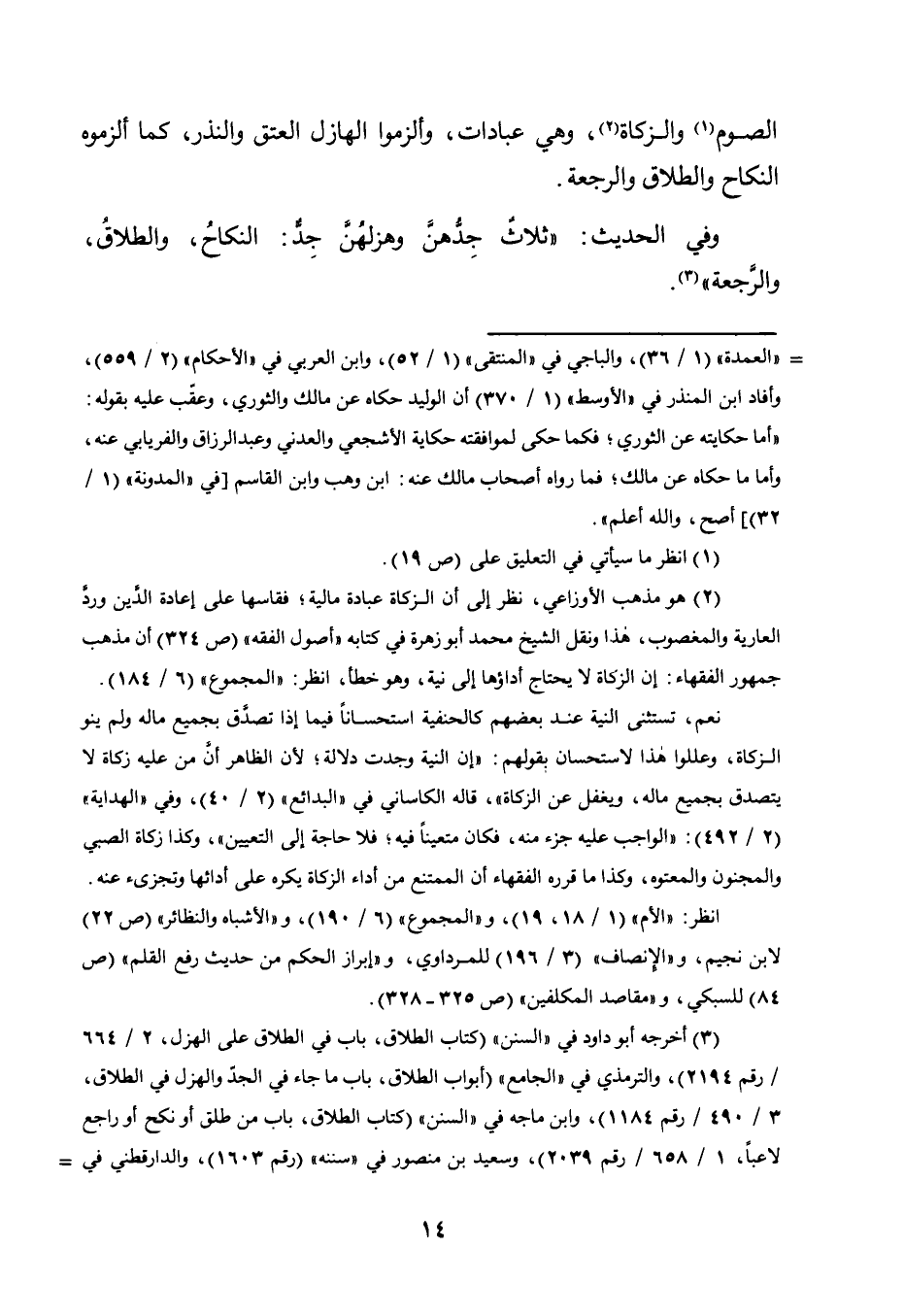 3 أخرجه أو داود في "السنن" "كتاب الطلاق، باب في الطلاق على الهزل، 2/ 664/ رقم 2194"، والترمذي في "الجامع" "أبواب الطلاق، باب ما جاء في الجد والهزل في الطلاق 3/ 490/ 1184" وابن ماجه في "السنن" "كتاب الطلاق، باب من طلق أو نكح أو راجع لاعبًا، 1/ 658/ رقم 2039"، وسعيد بن منصور في "سننه" "رقم 1603"، والدارقطني في =