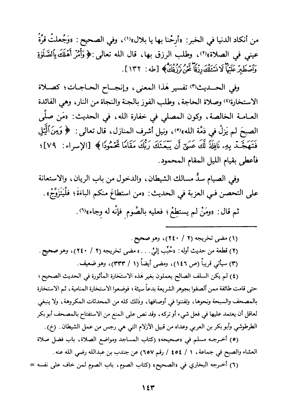 وَفِي الْحَدِيثِ3 تَفْسِيرُ هَذَا الْمَعْنَى، وَإِنْجَاحِ الْحَاجَاتِ؛ كَصَلَاةِ الِاسْتِخَارَةِ4 وَصَلَاةِ الْحَاجَةِ، وَطَلَبِ الْفَوْزِ بِالْجَنَّةِ وَالنَّجَاةِ مِنَ النار، وهي الفائدة العامة الخالصة، وَكَوْنِ الْمُصَلِّي فِي خِفَارَةِ اللَّهِ، فِي الْحَدِيثِ: "مَنْ صَلَّى الصُّبْحَ لَمْ يَزَلْ فِي ذِمَّةِ اللَّهِ" 5، وَنَيْلِ أَشْرَفِ الْمَنَازِلِ، قَالَ تَعَالَى: {وَمِنَ اللَّيْلِ فَتَهَجَّدْ بِهِ نَافِلَةً لَكَ عَسَى أَنْ يَبْعَثَكَ رَبُّكَ مَقَامًا مَحْمُودًا} [الْإِسْرَاءِ: 79] ؛ فَأُعْطِيَ بِقِيَامِ اللَّيْلِ الْمَقَامَ الْمَحْمُودَ.