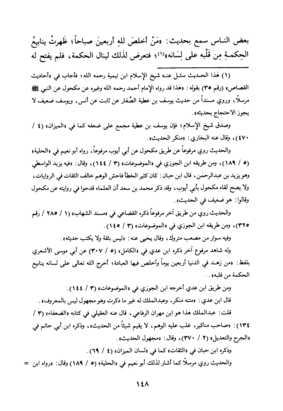 بَعْضَ النَّاسِ سَمِعَ بِحَدِيثِ: مَنْ أَخْلَصَ لِلَّهِ أَرْبَعِينَ صَبَاحًا؛ ظَهَرَتْ يَنَابِيعُ الْحِكْمَةِ مِنْ قَلْبِهِ عَلَى لِسَانِهِ"1؛ فَتَعَرَّضَ لِذَلِكَ لِيَنَالَ الْحِكْمَةَ، فَلَمْ يفتح له