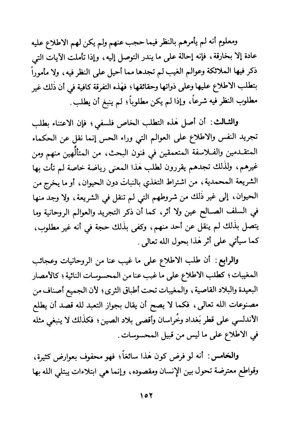 أَنَّ طَلَبَ الِاطِّلَاعِ عَلَى مَا غُيِّبَ عَنَّا مِنَ الرُّوحَانِيَّاتِ وَعَجَائِبِ الْمُغَيَّبَاتِ؛ كَطَلَبِ الِاطِّلَاعِ عَلَى مَا غُيِّبَ عَنَّا مِنَ الْمَحْسُوسَاتِ النَّائِيَةِ؛ كَالْأَمْصَارِ الْبَعِيدَةِ وَالْبِلَادِ الْقَاصِيَةِ، وَالْمُغَيَّبَاتِ تَحْتَ أَطْبَاقِ الثَّرَى؛ لِأَنَّ الْجَمِيعَ أَصْنَافٌ مِنْ مَصْنُوعَاتِ اللَّهِ تَعَالَى، فَكَمَا لَا يَصِحُّ أَنْ يُقَالَ بِجَوَازِ التَّعَبُّدِ لِلَّهِ قَصْدَ أَنْ يَطَّلِعَ الْأَنْدَلُسِيُّ عَلَى قُطْرِ بَغْدَادَ وَخُرَاسَانَ وَأَقْصَى بِلَادِ الصِّينِ؛ فَكَذَلِكَ لَا يَنْبَغِي مِثْلُهُ فِي الِاطِّلَاعِ عَلَى مَا لَيْسَ مِنْ قَبِيلِ الْمَحْسُوسَاتِ.