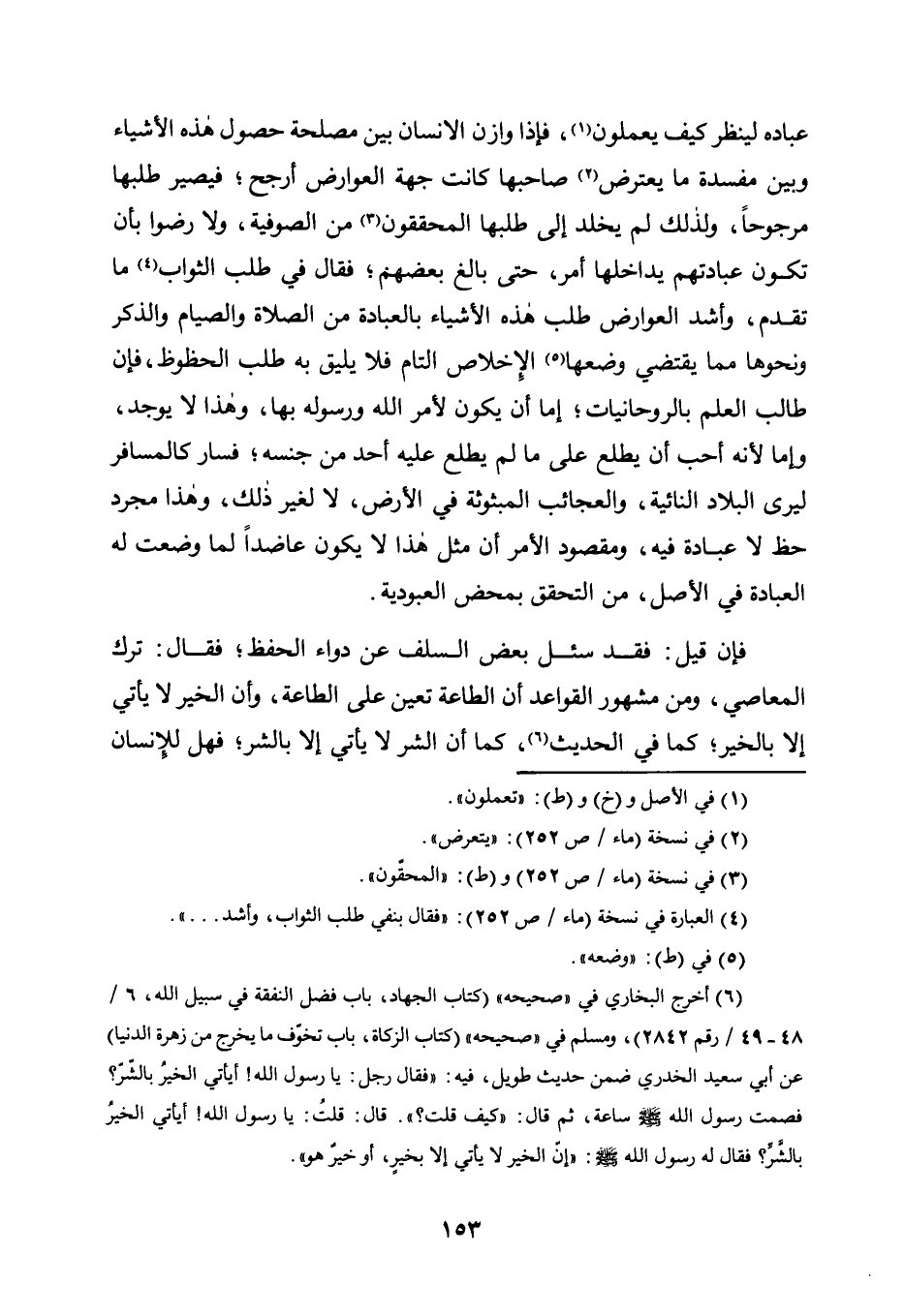 عِبَادَهُ لِيَنْظُرَ كَيْفَ يَعْمَلُونَ1، فَإِذَا وَازَنَ الْإِنْسَانُ بَيْنَ مَصْلَحَةِ حُصُولِ هَذِهِ الْأَشْيَاءِ وَبَيْنَ مَفْسَدَةِ مَا يَعْتَرِضُ2 صَاحِبَهَا كَانَتْ جِهَةُ الْعَوَارِضِ أَرْجَحَ؛ فَيَصِيرُ طَلَبُهَا مَرْجُوحًا، وَلِذَلِكَ لَمْ يَخْلُدْ إِلَى طَلَبِهَا الْمُحَقِّقُونَ3 مِنَ الصُّوفِيَّةِ، وَلَا رَضُوا بِأَنْ تَكُونَ عِبَادَتُهُمْ يُدَاخِلُهَا أَمْرٌ، حَتَّى بَالَغَ بَعْضُهُمْ؛ فَقَالَ فِي طَلَبِ الثَّوَابِ4 مَا تَقَدَّمَ، وَأَشَدُّ الْعَوَارِضِ طَلَبُ هَذِهِ الْأَشْيَاءِ بِالْعِبَادَةِ مِنَ الصَّلَاةِ وَالصِّيَامِ وَالذِّكْرِ وَنَحْوِهَا مِمَّا يَقْتَضِي وَضْعُهَا5 الْإِخْلَاصَ التَّامَّ فَلَا يَلِيقُ بِهِ طَلَبُ الْحُظُوظِ، فَإِنَّ طَالِبَ الْعِلْمِ بِالرُّوحَانِيَّاتِ؛ إِمَّا أَنْ يَكُونَ لِأَمْرِ اللَّهِ وَرَسُولِهِ بِهَا، وَهَذَا لَا يُوجَدُ، وَإِمَّا لِأَنَّهُ أَحَبَّ أَنْ يَطَّلِعَ عَلَى مَا لَمْ يَطَّلِعْ عَلَيْهِ أَحَدٌ مِنْ جِنْسِهِ؛ فَسَارَ كَالْمُسَافِرِ لِيَرَى الْبِلَادَ النَّائِيَةَ، وَالْعَجَائِبَ الْمَبْثُوثَةَ فِي الْأَرْضِ، لَا لِغَيْرِ ذَلِكَ، وَهَذَا مُجَرَّدُ حَظٍّ لَا عِبَادَةَ فِيهِ، وَمَقْصُودُ الْأَمْرِ أَنَّ مِثْلَ هَذَا لَا يَكُونُ عَاضِدًا لِمَا وُضِعَتْ لَهُ الْعِبَادَةُ فِي الْأَصْلِ، مِنَ التَّحَقُّقِ بِمَحْضِ الْعُبُودِيَّةِ.
