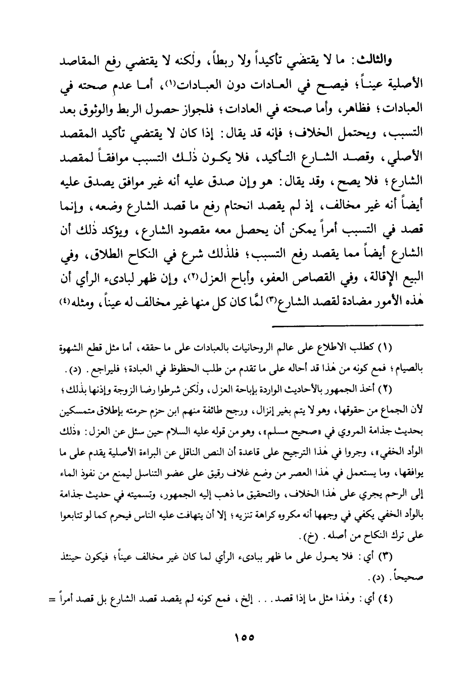مَا لَا يَقْتَضِي تَأْكِيدًا وَلَا رَبْطًا، وَلَكِنَّهُ لَا يَقْتَضِي رَفْعَ الْمَقَاصِدِ الْأَصْلِيَّةِ عَيْنًا؛ فَيَصِحُّ فِي الْعَادَاتِ دُونَ الْعِبَادَاتِ1، أَمَّا عَدَمُ صِحَّتِهِ فِي الْعِبَادَاتِ؛ فَظَاهِرٌ، وَأَمَّا صِحَّتُهُ فِي الْعَادَاتِ؛ فَلِجَوَازِ حُصُولِ الرَّبْطِ وَالْوُثُوقِ بَعْدَ التَّسَبُّبِ، وَيُحْتَمَلُ الْخِلَافُ؛ فَإِنَّهُ قَدْ يُقَالُ: إِذَا كَانَ لَا يَقْتَضِي تَأْكِيدَ الْمَقْصِدِ الْأَصْلِيِّ، وَقَصْدُ الشَّارِعِ التَّأْكِيدُ، فَلَا يَكُونُ ذَلِكَ التَّسَبُّبُ مُوَافِقًا لِمَقْصِدِ الشَّارِعِ؛ فَلَا يَصِحُّ، وَقَدْ يُقَالُ: هُوَ وَإِنْ صَدَقَ عَلَيْهِ أَنَّهُ غَيْرُ مُوَافِقٍ يَصْدُقُ عَلَيْهِ أَيْضًا أَنَّهُ غَيْرُ مُخَالِفٍ، إِذْ لَمْ يَقْصِدِ انْحِتَامَ رَفْعِ مَا قَصَدَ الشَّارِعُ وَضْعَهُ، وَإِنَّمَا قَصَدَ فِي التَّسَبُّبِ أَمْرًا يُمْكِنُ أَنْ يَحْصُلَ مَعَهُ مَقْصُودُ الشَّارِعِ، وَيُؤَكِّدُ ذَلِكَ أَنَّ الشَّارِعَ أَيْضًا مِمَّا يَقْصِدُ رَفْعَ التَّسَبُّبِ؛ فَلِذَلِكَ شَرَعَ فِي النِّكَاحِ الطَّلَاقَ، وَفِي الْبَيْعِ الْإِقَالَةَ، وَفِي الْقِصَاصِ الْعَفْوَ، وَأَبَاحَ الْعَزْلَ2، وَإِنْ ظَهَرَ لِبَادِئِ الرَّأْيِ أَنَّ هَذِهِ الْأُمُورَ مُضَادَّةٌ لِقَصْدِ الشَّارِعِ3 لَمَّا كَانَ كُلٌّ مِنْهَا غَيْرَ مُخَالِفٍ لَهُ عينًا، ومثله4