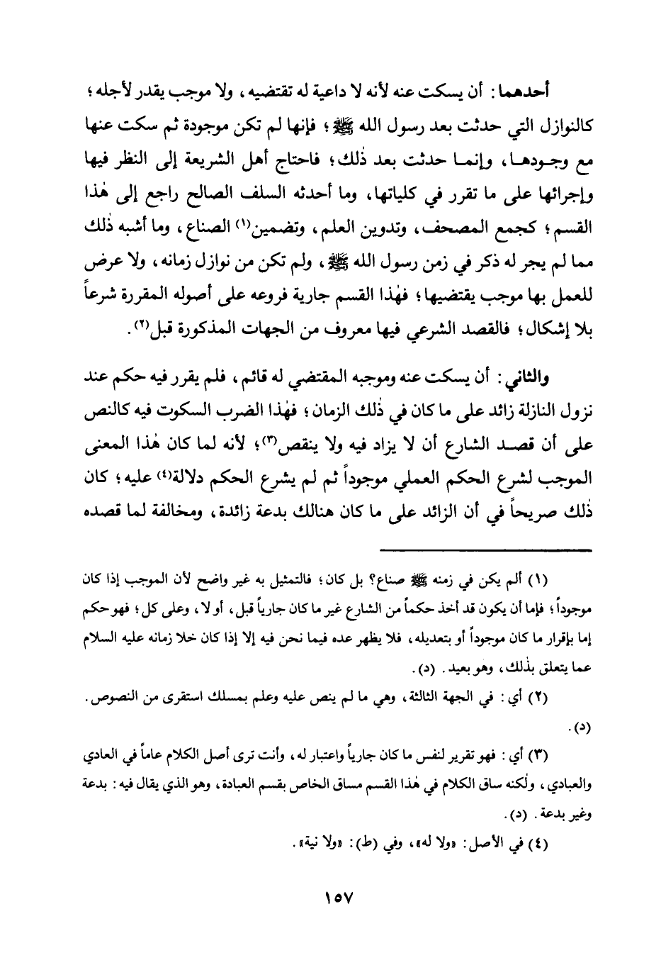 أَنْ يَسْكُتَ عَنْهُ لِأَنَّهُ لَا دَاعِيَةَ لَهُ تَقْتَضِيهِ، وَلَا مُوجِبَ يُقَدَّرُ لِأَجْلِهِ؛ كَالنَّوَازِلِ الَّتِي حَدَثَتْ بَعْدَ رَسُولِ اللَّهِ صَلَّى اللَّهُ عَلَيْهِ وَسَلَّمَ؛ فَإِنَّهَا لَمْ تَكُنْ مَوْجُودَةً ثُمَّ سُكِتَ عَنْهَا مَعَ وُجُودِهَا، وَإِنَّمَا حَدَثَتْ بَعْدَ ذَلِكَ؛ فَاحْتَاجَ أَهْلُ الشَّرِيعَةِ إِلَى النَّظَرِ فِيهَا وَإِجْرَائِهَا عَلَى مَا تَقَرَّرَ فِي كُلِّيَّاتِهَا، وَمَا أَحْدَثَهُ السَّلَفُ الصَّالِحُ رَاجِعٌ إِلَى هَذَا الْقِسْمِ؛ كَجَمْعِ الْمُصْحَفِ، وَتَدْوِينِ الْعِلْمِ، وَتَضْمِينِ1 الصُّنَّاعِ، وَمَا أَشْبَهَ ذَلِكَ مِمَّا لَمْ يَجْرِ لَهُ ذِكْرٌ فِي زَمَنِ رَسُولِ اللَّهِ صَلَّى اللَّهُ عَلَيْهِ وَسَلَّمَ، وَلَمْ تَكُنْ مِنْ نَوَازِلِ زَمَانِهِ، وَلَا عَرَضَ لِلْعَمَلِ بِهَا مُوجِبٌ يَقْتَضِيهَا؛ فَهَذَا الْقِسْمُ جَارِيَةٌ فُرُوعُهُ عَلَى أُصُولِهِ الْمُقَرَّرَةِ شَرْعًا بِلَا إِشْكَالٍ؛ فَالْقَصْدُ الشَّرْعِيُّ فِيهَا مَعْرُوفٌ مِنَ الْجِهَاتِ الْمَذْكُورَةِ قَبْلُ2.