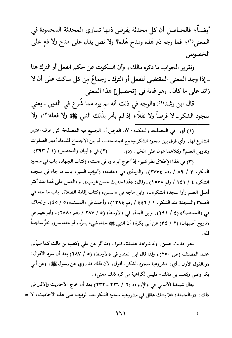 وقال شيخنا الألباني في "الإرواء" "2/ 226-232" بعد أن خرج الأحاديث والآثار في ذلك: "وبالجملة؛ فلا يشك عاقل في مشروعية سجود الشكر بعد الوقوف على هذا الأحاديث، لا سيما وقد جرى العمل عليها من السلف الصالح رضي الله عنهم".