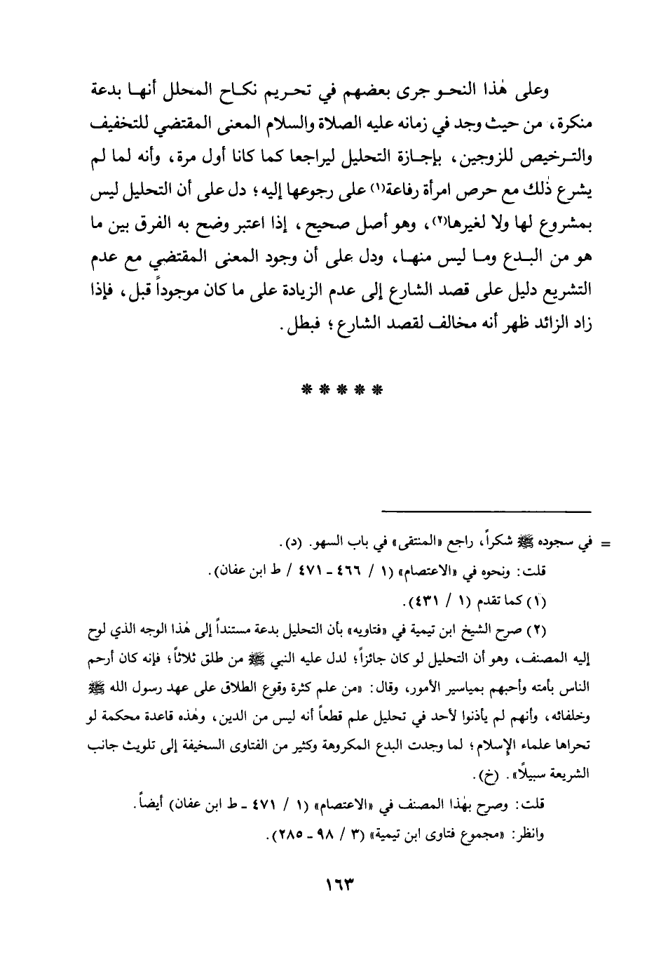 2 صرح الشيخ ابن تيمية في "فتاويه" بأن التحليل بدعة مستندا إلى هذا الوجه الذي لوح إليه المصنف، وهو أن التحليل لو كان جائزا، لدل عليه النبي صلى الله عليه وسلم من طلق ثلاثا؛ فإنه كان أرحم الناس بأمته وأحبهم بمياسير الأمور، وقال: "من علم كثرة وقوع الطلاق عَلَى عَهْدِ رَسُولِ اللَّهِ صَلَّى اللَّهُ عَلَيْهِ وسلم وخلفائه، وأنهم لم يأذنوا لأحد في تحليل علم قطعًا أنه ليس من الدين، وهذه قاعدة محكمة لو تحراها علماء الإسلام؛ لما وجدت البدع المكروهة وكثير من الفتاوى السخيفة إلى تلويث جانب الشريعة سبيلا". "خ".