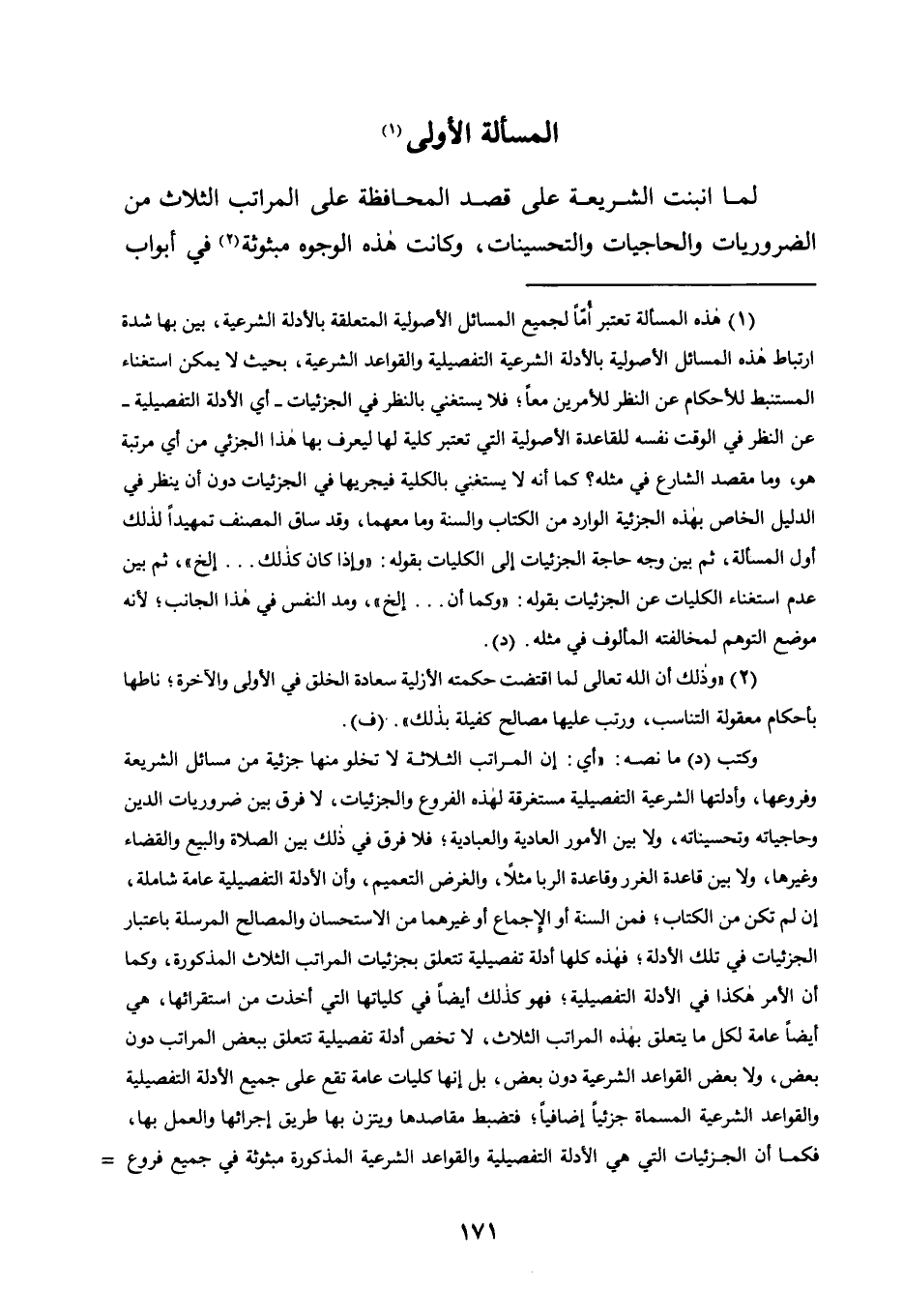 وكتب "د" ما نصه: "أي: إن المراتب الثلاثة لا تخلو منها جزئية من مسائل الشريعة وفروعها، وأدلتها الشرعية التفصيلية مستغرقة لهذه الفروع والجزئيات، لا فرق بين ضروريات الدين وحاجياته وتحسيناته، ولا بين الأمور العادية والعبادية؛ فلا فرق في ذلك بين الصلاة والبيع والقضاء وغيرها، ولا بين قاعدة الغرر وقاعدة الربا مثلا، والغرض التعميم، وأن الأدلة التفصيلية عامة شاملة، إن لم تكن من الكتاب؛ فمن السنة أو الإجماع أو غيرهما من الاستحسان والمصالح المرسلة باعتبار الجزئيات في تلك الأدلة؛ فهذه كلها أدلة تفصيلية تتعلق بجزئيات المراتب الثلاث المذكورة، وكما أن الأمر هكذا في الأدلة التفصيلية؛ فهو كذلك أيضا في كلياتها التي أخذت من استقرائها، هي أيضا عامة لكل ما يتعلق بهذه المراتب الثلاث، لا تخص أدلة تفصيلية تتعلق ببعض المراتب دون بعض، ولا بعض القواعد الشرعية دون بعض، بل إنها كليات عامة تقع على جميع الأدلة التفصيلية والقواعد الشرعية المسماة جزئيا إضافيا؛ فتضبط مقاصدها ويتزن بها طريق إجرائها والعمل بها، فكما أن الجزئيات التي هي الأدلة التفصيلية والقواعد الشرعية المذكورة مبثوثة في جميع فروع =