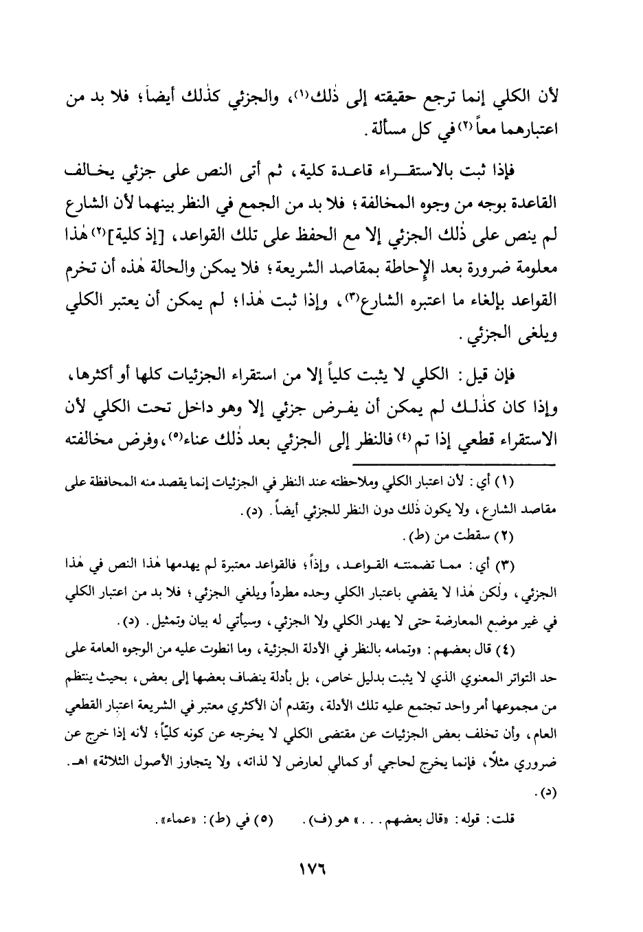 4 قال بعضهم: "وتمامه بالنظر في الأدلة الجزئية، وما انطوت عليه من الوجوه العامة على حد التواتر الْمَعْنَوِيِّ الَّذِي لَا يُثْبَتُ بِدَلِيلٍ خَاصٍّ، بَلْ بأدلة ينضاف بعضها إلى بعض، بِحَيْثُ يَنْتَظِمُ مِنْ مَجْمُوعِهَا أَمْرٌ وَاحِدٌ تَجْتَمِعُ عليه تلك الأدلة، وتقدم أن الأكثري معتبر في الشريعة اعتبار القطعي العام، وأن تخلف بعض الجزئيات عن مقتضى الكلي لا يخرجه عن كونه كليا؛ لأنه إذا خرج عن ضروري مثلا، فإنما يخرج لحاجي أو كمالي لعارض لا لذاته، ولا يتجاوز الأصول الثلاثة" ا. هـ. "د".