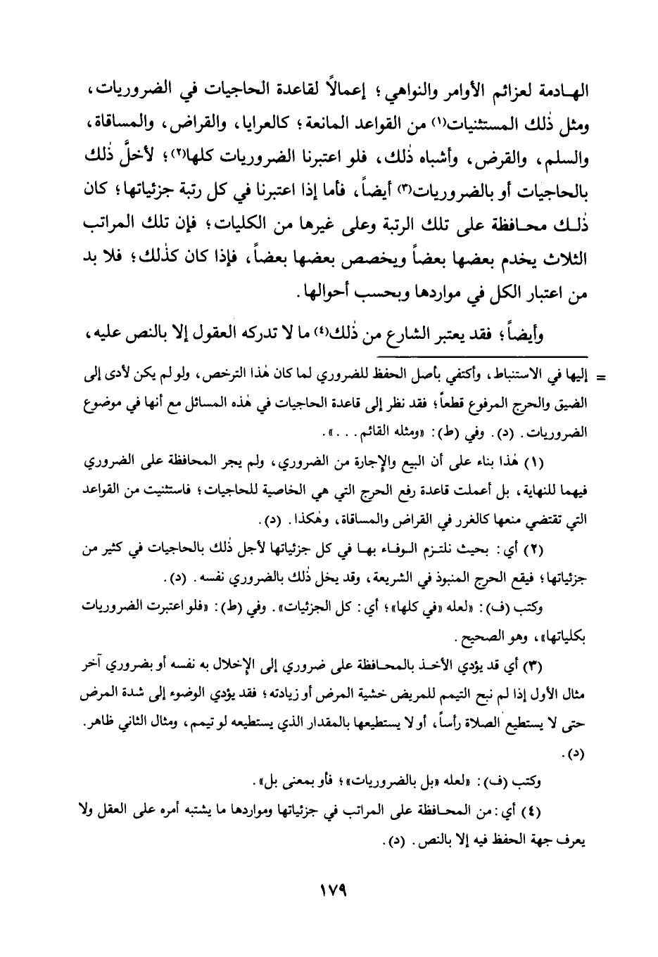 الْهَادِمَةُ لِعَزَائِمِ الْأَوَامِرِ وَالنَّوَاهِي؛ إِعْمَالًا لِقَاعِدَةِ الْحَاجِيَّاتِ في الضروريات، ومثل ذلك المستثنيات1 من القوعد الْمَانِعَةِ؛ كَالْعَرَايَا، وَالْقِرَاضِ، وَالْمُسَاقَاةِ، وَالسَّلَمِ، وَالْقَرْضِ، وَأَشْبَاهِ ذَلِكَ، فَلَوِ اعْتَبَرْنَا الضَّرُورِيَّاتِ كُلَّهَا2؛ لَأَخَلَّ ذَلِكَ بِالْحَاجِيَّاتِ أَوْ بِالضَّرُورِيَّاتِ3 أَيْضًا، فَأَمَّا إِذَا اعْتَبَرْنَا في كل رتبة جزئياتها؛ كان ذلك محافظة عَلَى تِلْكَ الرُّتْبَةِ وَعَلَى غَيْرِهَا مِنَ الْكُلِّيَّاتِ؛ فإن تلك المراتب الثلاث يخدم بعضها بعضها ويخصص بَعْضُهَا بَعْضًا، فَإِذَا كَانَ كَذَلِكَ؛ فَلَا بُدَّ مِنَ اعْتِبَارِ الْكُلِّ فِي مَوَارِدِهَا وَبِحَسِبِ أَحْوَالِهَا.
