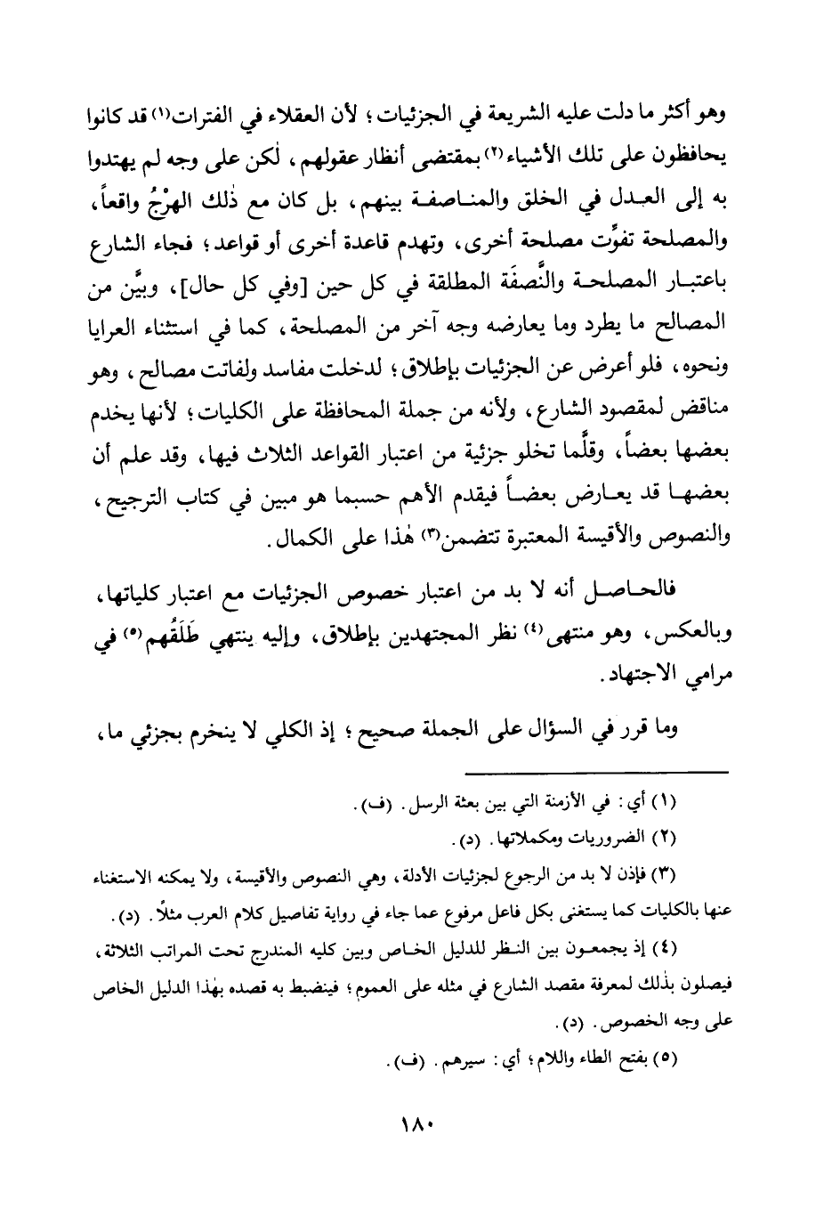 وَهُوَ أَكْثَرُ مَا دَلَّتْ عَلَيْهِ الشَّرِيعَةُ فِي الْجُزْئِيَّاتِ؛ لِأَنَّ الْعُقَلَاءَ فِي الْفَتَرَاتِ1 قَدْ كَانُوا يُحَافِظُونَ عَلَى تِلْكَ الْأَشْيَاءِ2 بِمُقْتَضَى أَنْظَارِ عُقُولِهِمْ، لكن على وجه لم يتجهوا بِهِ إِلَى الْعَدْلِ فِي الْخَلْقِ وَالْمُنَاصَفَةِ بَيْنَهُمْ، بل كان مع ذلك الهرج واقعًا، والمصلح تُفَوِّتُ مَصْلَحَةً أُخْرَى، وَتَهْدِمُ قَاعِدَةً أُخْرَى أَوْ قواعد؛ فجاء الشارع بِاعْتِبَارِ الْمَصْلَحَةِ وَالنَّصَفَةِ الْمُطْلَقَةِ فِي كُلِّ حِينٍ [وَفِي كُلِّ حَالٍ] ، وَبَيَّنَ مِنَ الْمَصَالِحِ مَا يَطَّرِدُ وَمَا يُعَارِضُهُ وَجْهٌ آخَرُ مِنَ الْمَصْلَحَةِ، كَمَا فِي اسْتِثْنَاءِ الْعَرَايَا وَنَحْوِهِ، فَلَوْ أَعْرَضَ عَنِ الْجُزْئِيَّاتِ بِإِطْلَاقٍ؛ لَدَخَلَتْ مَفَاسِدُ وَلَفَاتَتْ مَصَالِحُ، وَهُوَ مُنَاقِضٌ لِمَقْصُودِ الشَّارِعِ، وَلِأَنَّهُ مِنْ جُمْلَةِ الْمُحَافَظَةِ عَلَى الْكُلِّيَّاتِ؛ لِأَنَّهَا يَخْدِمُ بَعْضُهَا بَعْضًا، وَقَلَّمَا تَخْلُو جُزْئِيَّةٌ مِنَ اعْتِبَارِ الْقَوَاعِدِ الثَّلَاثِ فِيهَا، وَقَدْ عُلِمَ أَنَّ بَعْضَهَا قَدْ يُعَارِضُ بَعْضًا فَيُقَدَّمُ الْأَهَمُّ حَسَبَمَا هُوَ مُبَيَّنٌ فِي كِتَابِ التَّرْجِيحِ، وَالنُّصُوصُ وَالْأَقْيِسَةُ الْمُعْتَبَرَةُ تَتَضَمَّنُ3 هَذَا عَلَى الْكَمَالِ.