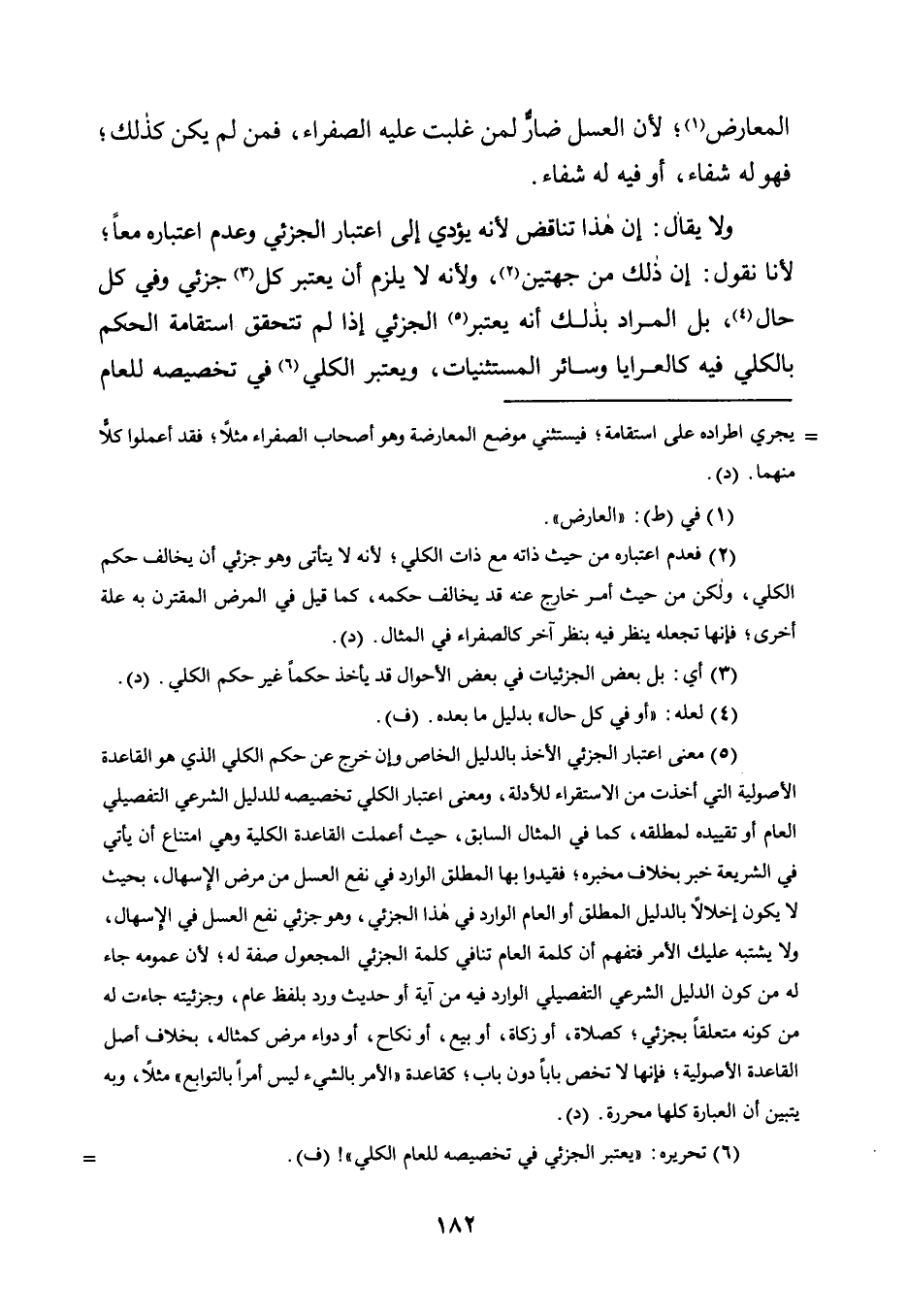 5 معنى اعتبار الجزئي الأخذ بالدليل الخاص وإن خرج عن حكم الكلي الذي هو القاعدة الأصولية التي أخذت من الاستقراء للأدلة، ومعنى اعتبار الكلي تخصيصه للدليل الشرعي التفصيلي العام أو تقييده لمطلقه، كما في المثال السابق، حيث أعملت القاعدة الكلية وهي امتناع أن يأتي في الشرعية خبر بخلاف مخبره؛ فقيدوا بها المطلق الوارد في نفع العسل من مرض الإسهال، بحيث لا يكون إخلالًا بالدليل المطلق أو العام الوارد في هذا الجزئي، وهو جزئي نفع العسل في الإسهال، ولا يشتبه عليك الأمر فتفهم أن كلمة العام تنافي كلمة الجزئي المجعول صفة له؛ لأن عمومه جاء له من كون الدليل الشرعي التفصيلي الوارد فيه من آية أو حديث ورد بلفظ عام، وجزئيته جاءت له من كونه متعلقا بجزئي؛ كصلاة، أو زكاة، أو بيع، أو نكاح، أو داوء مرض كمثاله، بخلاف أصل القاعدة الأصولية؛ فإنها لا تخص بابًا دون باب؛ كقاعدة "الأمر بالشيء ليس أمرًا بالتوابع" مثلا، وبه يتبين أن العبارة كلها محررة. "د".