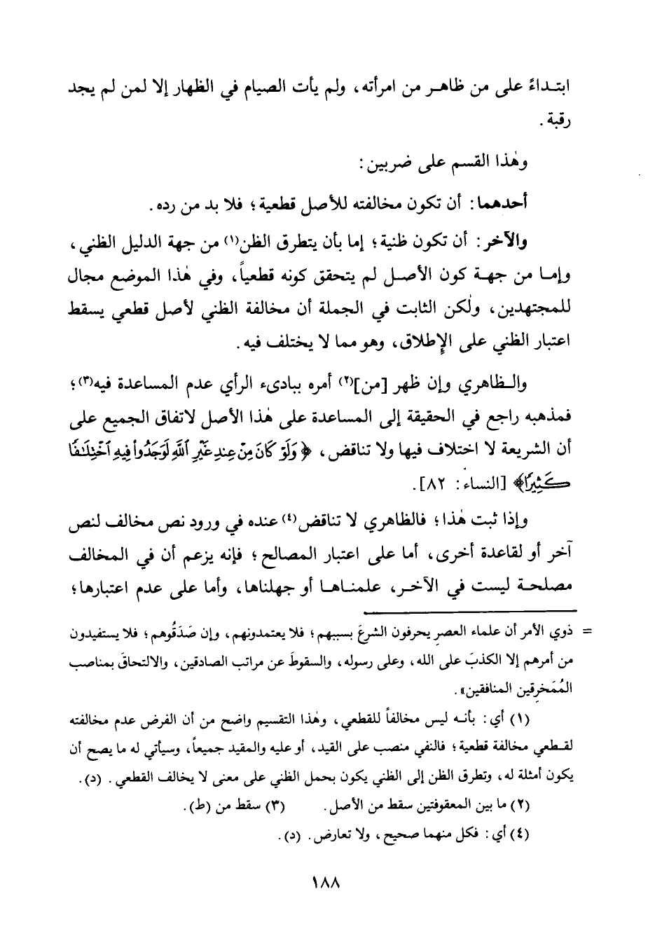 أَنْ تَكُونَ ظَنِّيَّةً؛ إِمَّا بِأَنْ يَتَطَرَّقَ الظَّنُّ1 مِنْ جِهَةِ الدَّلِيلِ الظَّنِّيِّ، وَإِمَّا مِنْ جِهَةِ كَوْنِ الْأَصْلِ لَمْ يَتَحَقَّقْ كَوْنُهُ قَطْعِيًّا، وَفِي هَذَا الْمَوْضِعِ مَجَالٌ لِلْمُجْتَهِدِينَ، وَلَكِنَّ الثَّابِتَ فِي الْجُمْلَةِ أَنَّ مُخَالَفَةَ الظَّنِّيِّ لِأَصْلٍ قَطْعِيٍّ يُسْقِطُ اعْتِبَارَ الظَّنِّيِّ عَلَى الْإِطْلَاقِ، وَهُوَ مِمَّا لَا يُخْتَلَفُ فِيهِ.