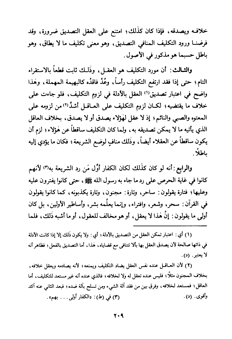 أَنَّ مَوْرِدَ التَّكْلِيفِ هُوَ الْعَقْلُ، وَذَلِكَ ثَابِتٌ قَطْعًا بِالِاسْتِقْرَاءِ التَّامِّ؛ حَتَّى إِذَا فُقِدَ ارْتَفَعَ التَّكْلِيفُ رَأْسًا، وَعُدَّ فَاقِدُهُ كَالْبَهِيمَةِ الْمُهْمَلَةِ، وَهَذَا وَاضِحٌ فِي اعْتِبَارِ تَصْدِيقِ1 الْعَقْلِ بِالْأَدِلَّةِ فِي لُزُومِ التَّكْلِيفِ، فَلَوْ جَاءَتْ عَلَى خِلَافِ مَا يَقْتَضِيهِ؛ لَكَانَ لُزُومُ التَّكْلِيفِ عَلَى الْعَاقِلِ أَشَدَّ2 مِنْ لُزُومِهِ عَلَى الْمَعْتُوهِ وَالصَّبِيِّ وَالنَّائِمِ؛ إِذْ لَا عَقْلَ لِهَؤُلَاءِ يُصَدِّقُ أَوْ لَا يُصَدِّقُ، بِخِلَافِ الْعَاقِلِ الَّذِي يَأْتِيهِ مَا لَا يُمْكِنُ تَصْدِيقُهُ بِهِ، وَلَمَّا كَانَ التَّكْلِيفُ سَاقِطًا عَنْ هَؤُلَاءِ؛ لَزِمَ أَنْ يَكُونَ سَاقِطًا عَنِ الْعُقَلَاءِ أَيْضًا، وَذَلِكَ مُنَافٍ لِوَضْعِ الشَّرِيعَةِ؛ فَكَانَ مَا يُؤَدِّي إِلَيْهِ بَاطِلًا.