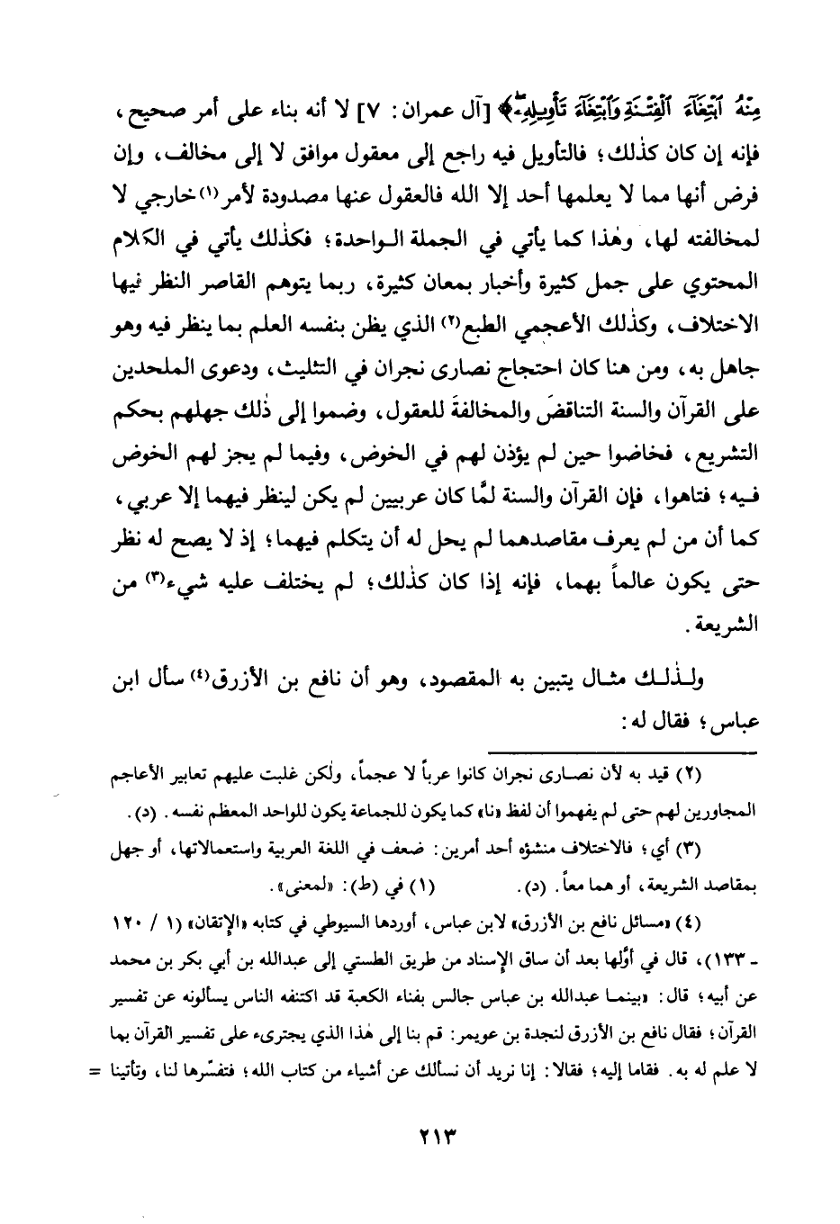 مِنْهُ ابْتِغَاءَ الْفِتْنَةِ وَابْتِغَاءَ تَأْوِيلِهِ} [آلِ عِمْرَانَ: 7] لَا أَنَّهُ بِنَاءٌ عَلَى أَمْرٍ صَحِيحٍ، فَإِنَّهُ إِنْ كَانَ كَذَلِكَ؛ فَالتَّأْوِيلُ فِيهِ رَاجِعٌ إِلَى مَعْقُولٍ مُوَافِقٍ لَا إِلَى مُخَالِفٍ، وَإِنْ فُرِضَ أَنَّهَا مِمَّا لَا يَعْلَمُهَا أَحَدٌ إِلَّا اللَّهُ فَالْعُقُولُ عَنْهَا مَصْدُودَةٌ لِأَمْرٍ1 خَارِجِيٍّ لَا لِمُخَالَفَتِهِ لَهَا، وَهَذَا كَمَا يَأْتِي فِي الْجُمْلَةِ الْوَاحِدَةِ؛ فَكَذَلِكَ يَأْتِي فِي الْكَلَامِ الْمُحْتَوِي عَلَى جُمَلٍ كَثِيرَةٍ وَأَخْبَارٍ بِمَعَانٍ كَثِيرَةٍ، رُبَّمَا يَتَوَهَّمُ الْقَاصِرُ النَّظَرِ فِيهَا الِاخْتِلَافَ، وَكَذَلِكَ الْأَعْجَمِيُّ الطَّبْعِ2 الَّذِي يَظُنُّ بِنَفْسِهِ الْعِلْمَ بِمَا يَنْظُرُ فِيهِ وَهُوَ جَاهِلٌ بِهِ، وَمِنْ هُنَا كَانَ احْتِجَاجُ نَصَارَى نَجْرَانَ فِي التَّثْلِيثِ، وَدَعْوَى الْمُلْحِدِينَ عَلَى الْقُرْآنِ وَالسُّنَّةِ التَّنَاقُضَ وَالْمُخَالَفَةَ لِلْعُقُولِ، وَضَمُّوا إِلَى ذَلِكَ جَهْلَهُمْ بِحِكَمِ التَّشْرِيعِ، فَخَاضُوا حِينَ لَمْ يُؤْذَنْ لَهُمْ فِي الْخَوْضِ، وَفِيمَا لَمْ يَجُزْ لَهُمُ الْخَوْضُ فِيهِ؛ فَتَاهُوا، فَإِنَّ الْقُرْآنَ وَالسُّنَّةَ لَمَّا كان عَرَبِيَّيْنِ لَمْ يَكُنْ لِيَنْظُرَ فِيهِمَا إِلَّا عَرَبِيٌّ، كَمَا أَنَّ مَنْ لَمْ يَعْرِفْ مَقَاصِدَهُمَا لَمْ يحل له أن يتكلم فيهما؛ إذًا لَا يَصِحُّ لَهُ نَظَرٌ حَتَّى يَكُونَ عَالِمًا بِهِمَا، فَإِنَّهُ إِذَا كَانَ كَذَلِكَ؛ لَمْ يَخْتَلِفْ عَلَيْهِ شَيْءٌ3 مِنَ الشَّرِيعَةِ.