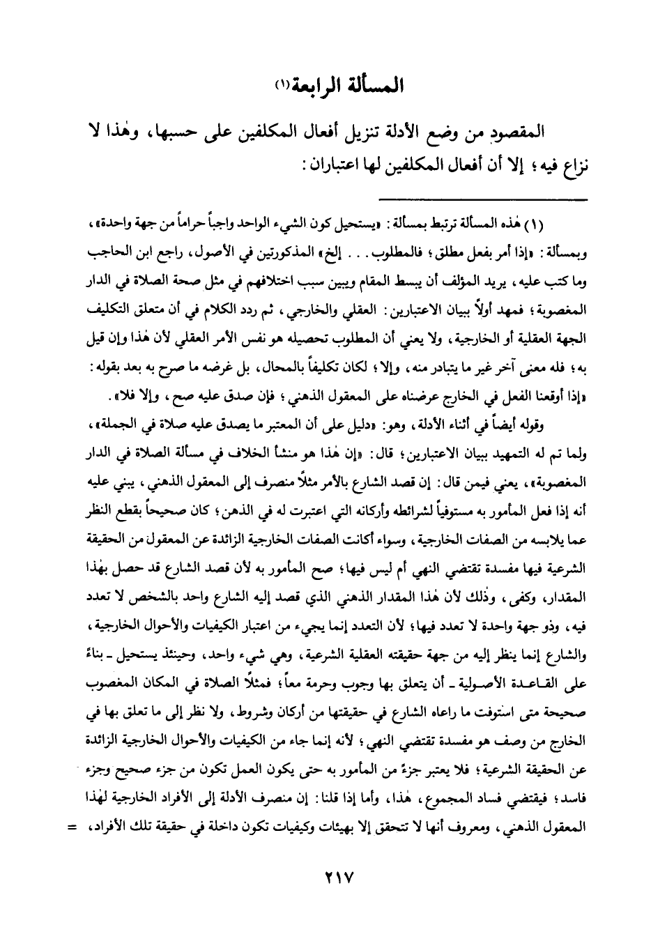 وقوله أيضا في أثناء الأدلة، وهو: "دليل على أن المعتبر ما يصدق عليه صلاة في الجملة"، ولما تم له التمهيد ببيان الاعتبارين؛ قال: "إن هذا هو منشأ الخلاف في مسألة الصلاة في الدار المغصوبة"، يعني فيمن قال: إن قصد الشارع بالأمر مثلا منصرف إلى المعقول الذهني، يبني عليه أنه إذا فعل المأمور به مستوفيًا لشرائطه وأركانه التي اعتبرت له في الذهن؛ كان صحيحًا بقطع النظر عما يلابسه من الصفات الخارجية، وسواء أكانت الصفات الخارجيه الزائدة عن المقعول من الحقيقة الشرعية فيها مفسدة تقتضي النهي أم ليس فيها؛ صح المأمور به لأن قصد الشارع قد حصل بهذا المقدار، وكفى، وذلك لأن هذا المقدار الذهني الذي قصد إليه الشارع واحد بالشخص لا تعدد فيه، وذو جهة واحدة لا تعدد فيها؛ لأن التعدد إنما يجيء من اعتبار الكيفيات والأحوال الخارجية، والشارع إنما ينظر إليه من جهة حقيقته العقلية الشرعية، وهي شيء واحد، وحينئذ يستحيل -بناء على القاعدة الأصولية- أن يتعلق بها وجوب وحرمة معًا؛ فمثلا الصلاة في المكان المغصوب صحيحة متى استوفت ما راعاه الشارع في حقيقتها من أركان وشروط ولا نظر إلا ما تعلق بها في الخارج من وصف هو مفسدة تقتضي النهي؛ لأنه إنما جاء من الكيفيات والأحوال الخارجية الزائدة عن الحقيقة الشرعية؛ فلا يعتبر جزءًا من المأمور به حتى يكون العمل تكوّن من جزء صحيح وجزء فاسد؛ فيقتضي فساد المجموع هذا، وأما إذا قلنا: إن منصرف الأدلة إلى الأفراد الخارجية لهذا المعقول الذهني، ومعروف أنها لا تتحقق إلا بهيئات وكيفيات تكون داخلة في حقيقة تلك الأفراد، =