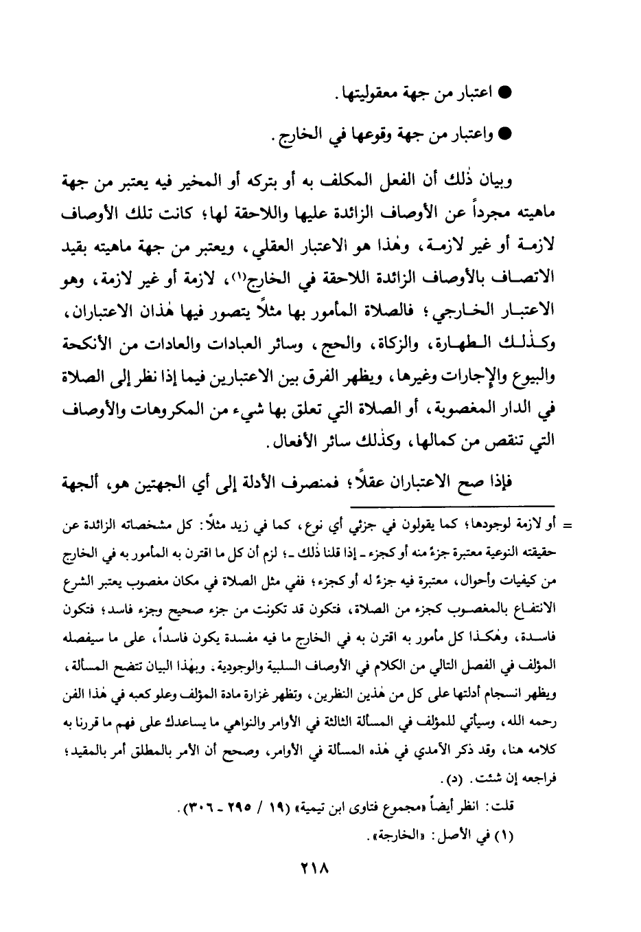وَبَيَانُ ذَلِكَ أَنَّ الْفِعْلَ الْمُكَلَّفَ بِهِ أَوْ بِتَرْكِهِ أَوِ الْمُخَيَّرَ فِيهِ يُعْتَبَرُ مِنْ جِهَةِ مَاهِيَّتِهِ مُجَرَّدًا عَنِ الْأَوْصَافِ الزَّائِدَةِ عَلَيْهَا وَاللَّاحِقَةِ لَهَا؛ كَانَتْ تِلْكَ الْأَوْصَافُ لَازِمَةً أَوْ غَيْرَ لَازِمَةٍ، وَهَذَا هُوَ الِاعْتِبَارُ الْعَقْلِيُّ، وَيُعْتَبَرُ مِنْ جِهَةِ مَاهِيَّتِهِ بِقَيْدِ الِاتِّصَافِ بِالْأَوْصَافِ الزَّائِدَةِ اللَّاحِقَةِ فِي الْخَارِجِ1، لَازِمَةً أَوْ غَيْرَ لَازِمَةٍ، وَهُوَ الِاعْتِبَارُ الْخَارِجِيُّ؛ فَالصَّلَاةُ الْمَأْمُورُ بِهَا مَثَلًا يُتَصَوَّرُ فِيهَا هَذَانِ الِاعْتِبَارَانِ، وَكَذَلِكَ الطَّهَارَةُ، وَالزَّكَاةُ، وَالْحَجُّ، وَسَائِرُ الْعِبَادَاتِ وَالْعَادَاتِ مِنَ الْأَنْكِحَةِ وَالْبُيُوعِ وَالْإِجَارَاتِ وَغَيْرِهَا، وَيَظْهَرُ الْفَرْقُ بَيْنَ الِاعْتِبَارَيْنِ فِيمَا إِذَا نُظِرَ إِلَى الصَّلَاةِ فِي الدَّارِ الْمَغْصُوبَةِ، أَوِ الصَّلَاةِ الَّتِي تَعَلَّقَ بِهَا شَيْءٌ مِنَ الْمَكْرُوهَاتِ وَالْأَوْصَافِ الَّتِي تُنْقِصُ مِنْ كَمَالِهَا، وَكَذَلِكَ سَائِرُ الْأَفْعَالِ.